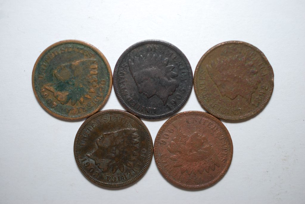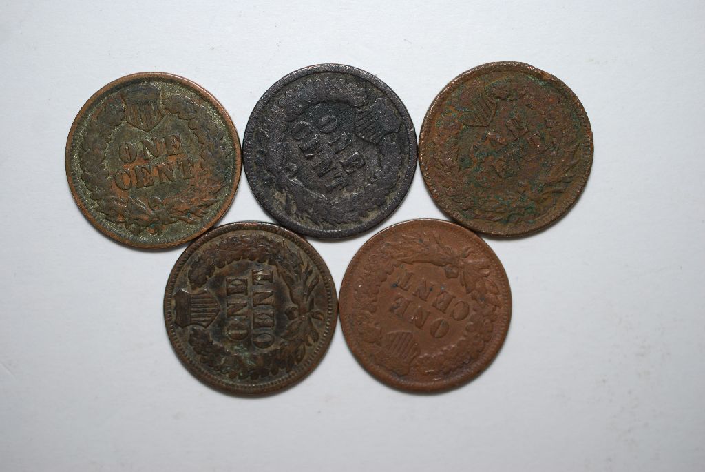 US Indian Head One Cent; Various Dates & Conditions; Lot of 5; EST. $5-10