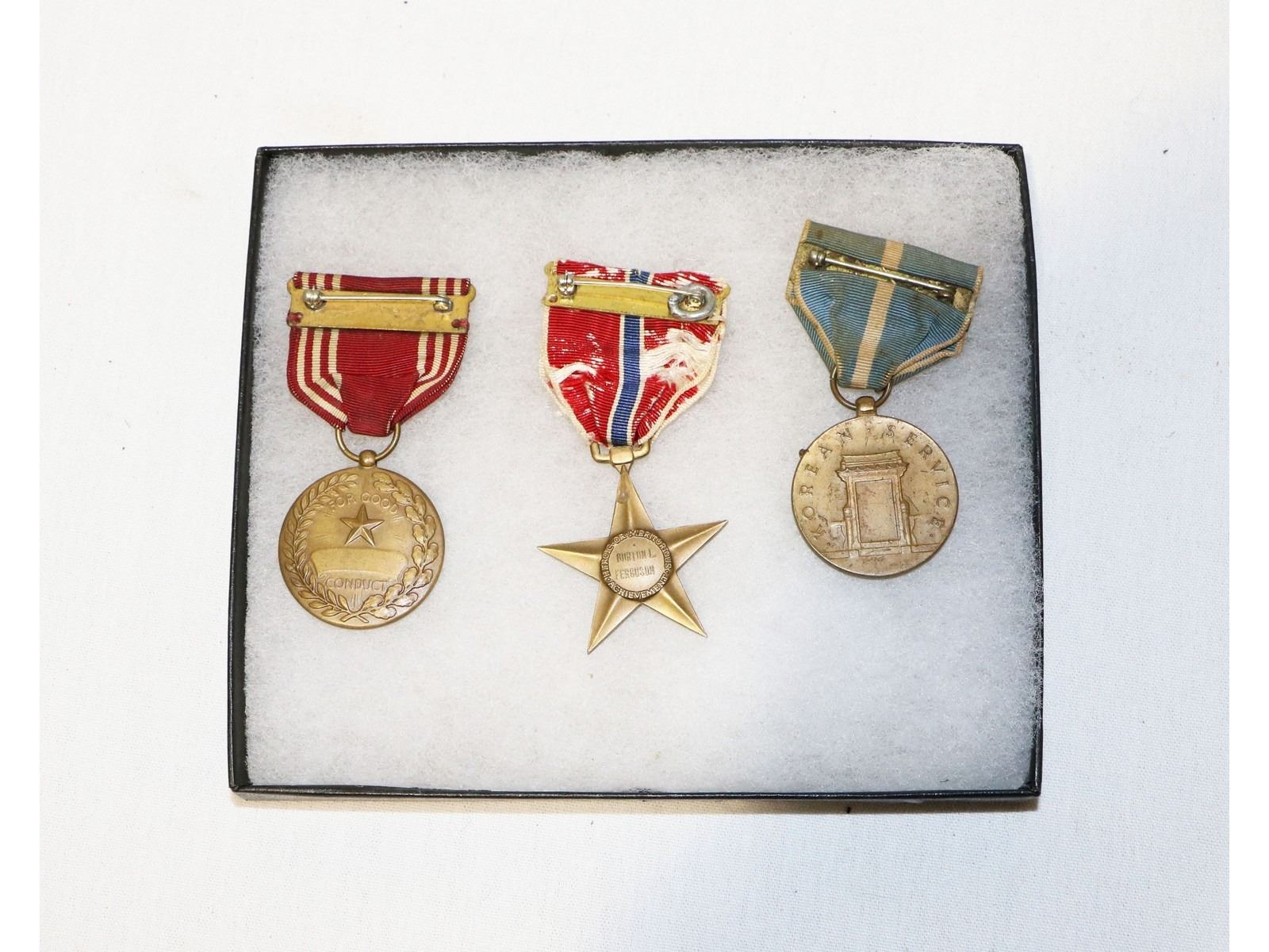 Includes: Bronze Star is engraved Burton L Ferguson & unnamed Good Conduct medal and Korean War Service medal. Display case is not included. See photos.
