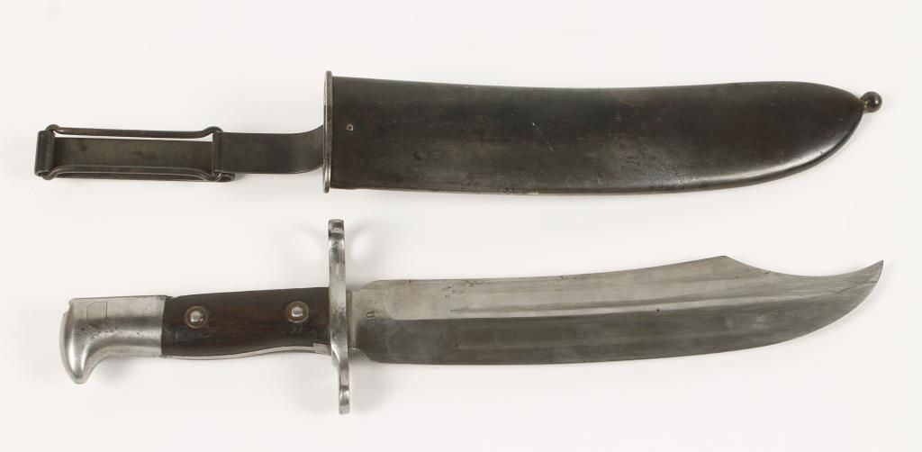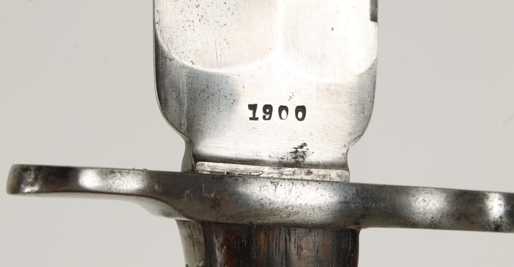 Very rare piece, According to Paul Kiesling’s Bayonet’s of the World, a total of 2,800 of these combination bayonet / entrenching tools were produced at Springfield Armory in 1900, with 1,500 sent to the Philippines and 500 sent to Cuba for field testing. Most other sources place production at only 2,000 units – all manufactured in 1900. The blade is marked "1900" one side, and "US" on the other. There is some mottling of the metal, and small scratching on the wood. The metal scabbard is also included, dark patina, with some mottling and pitting. The knife is approx 13-1/2" overall with 9" blade. The scabbard is approx 10" long, 15" long with belt loop and swivel.