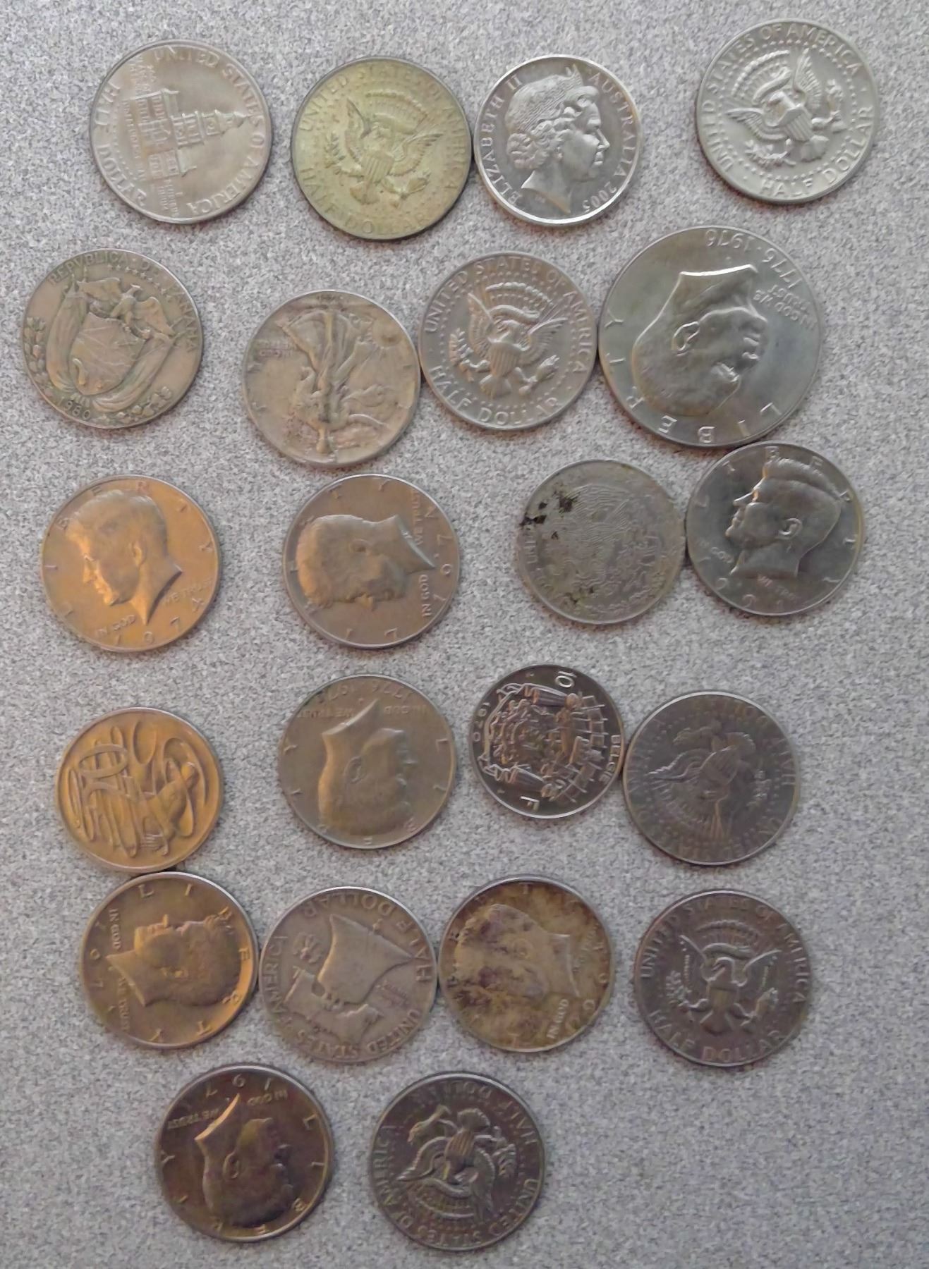 US Liberty $1, US Half Dollars (18), Australia coins (2), 1 10F Belgie Coin
