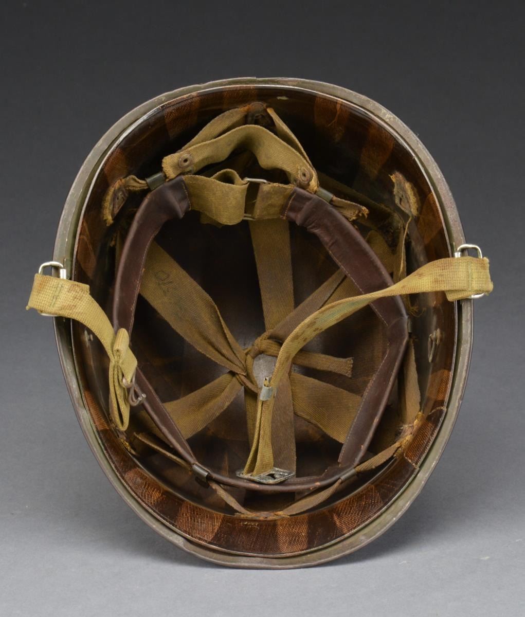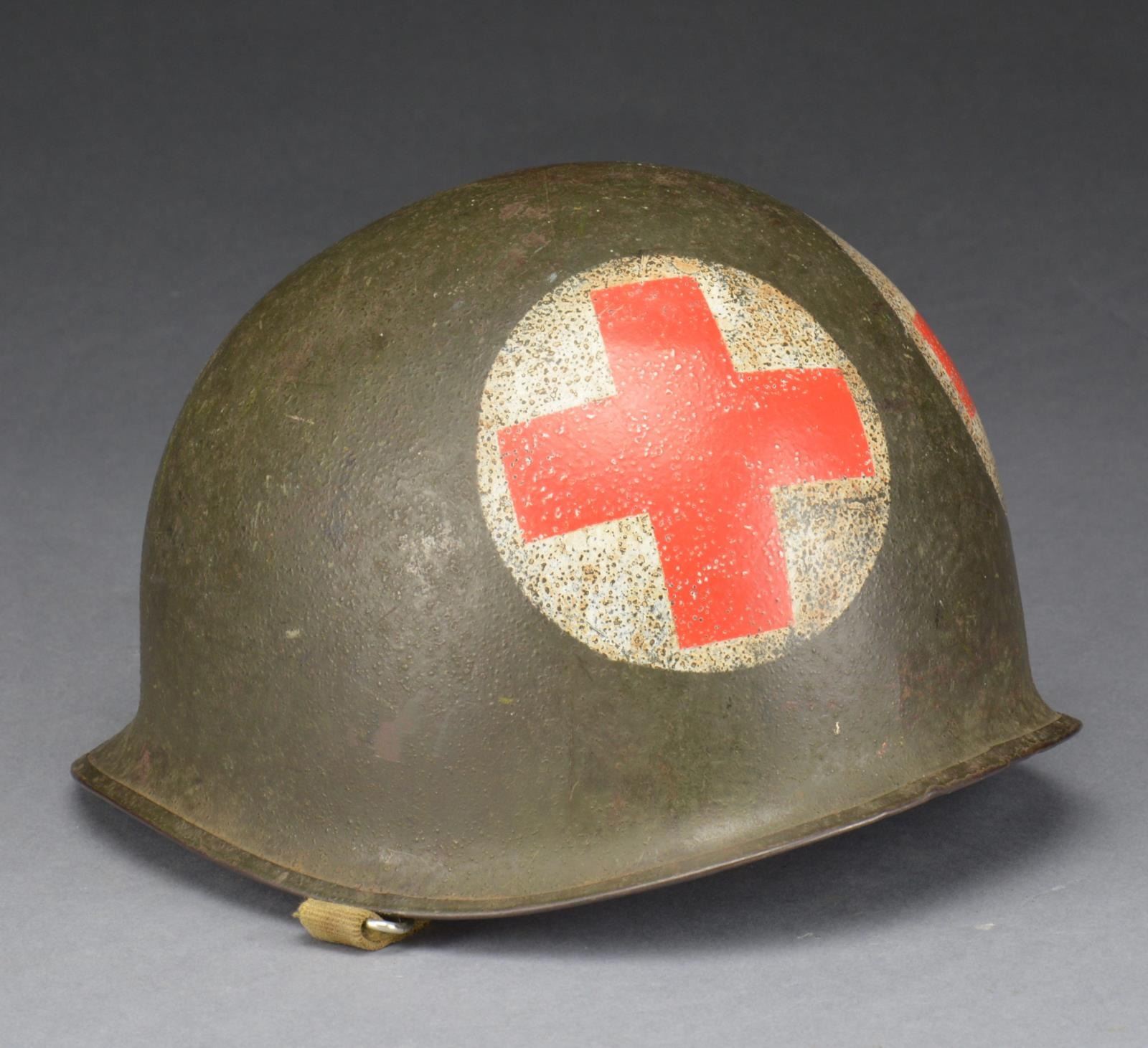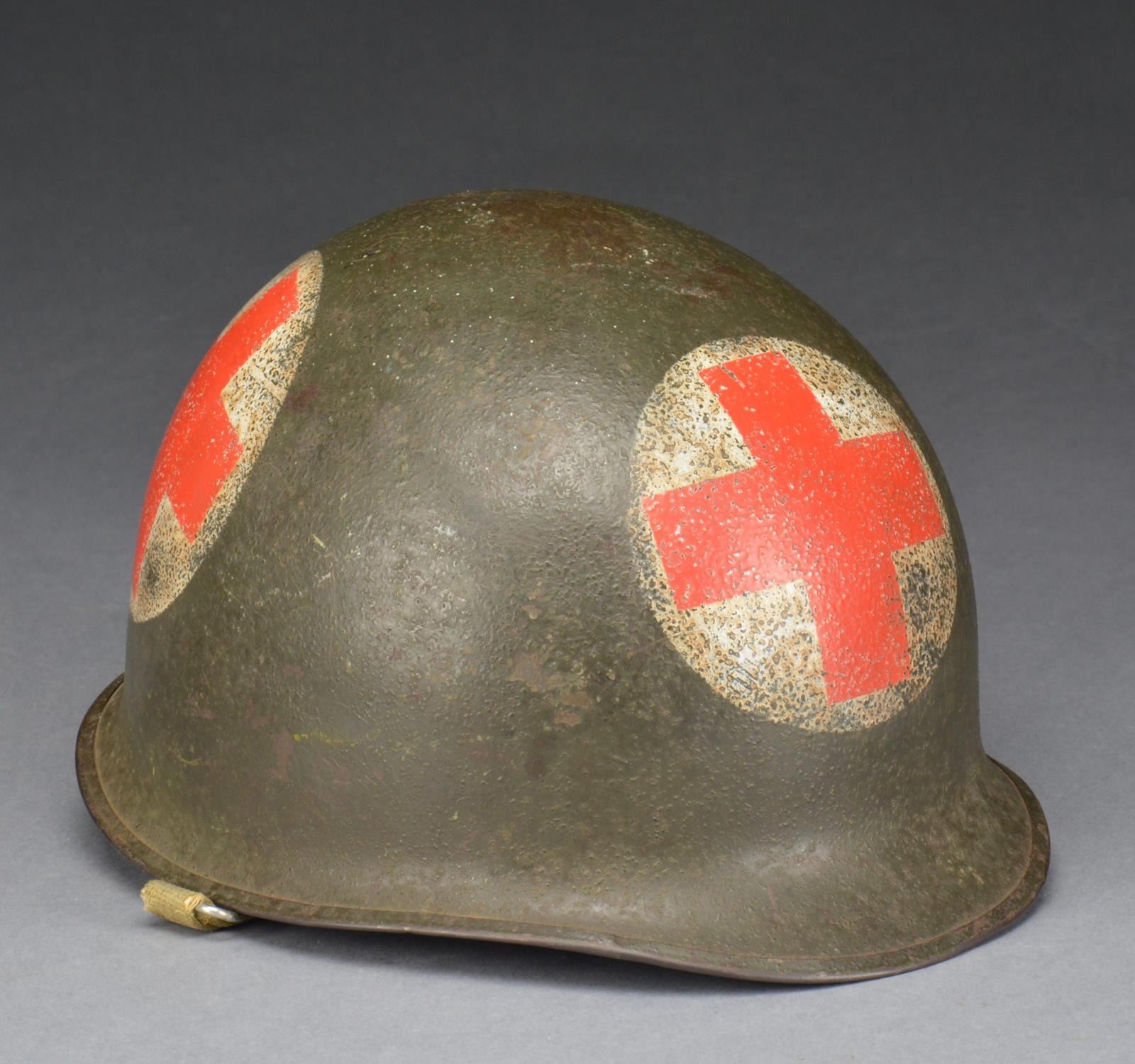 A rear seam, swivel bail helmet of late WWII or Korean War vintage. Body of helmet has red & white medic insignia on the front as well as the left & right rear. Full cotton chinstrap. Liner also has a red & white cross on the front along w/ left & right rear. Liner is of WWII vintage w/ central front vent. CONDITION: helmet finish is approx. 85%. Liner finish is 95%. Liner is complete w/ moderate wear & sweat stains. (02-13965/BF). $200-300.