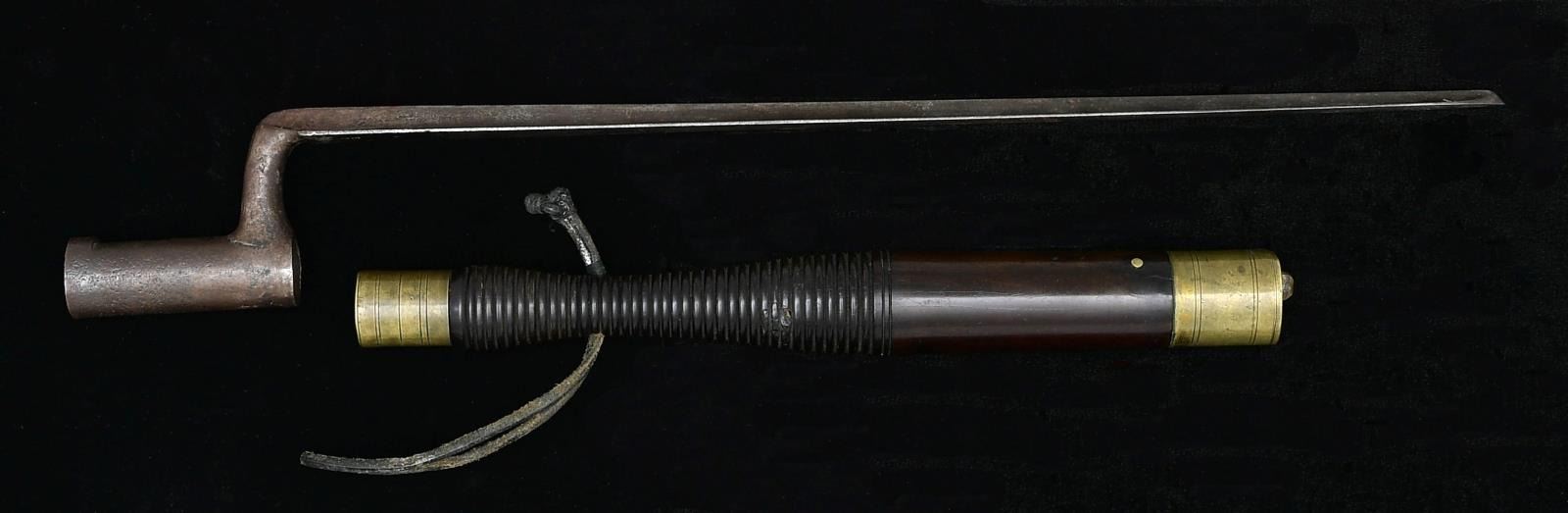 KNIFE. 1) BAYONET. This M1816 bayonet measures 19 1/8" overall with a 3" socket. The bayonet is marked on the face "US" over "_C". CONDITION: the bayonet has a dark overall patina with minor areas of pitting. 2) TRUNCHEON. A very interesting turned wood truncheon measuring 12" overall with a 5 1/2" turned wood grip. There is a 1 1/4" ferrule at the base, and a 1 1/2" ferrule at the top. In the center of the top is a small brass door that opens to reveal a collapsible 4" steel, 4-sided blade. CONDITION: truncheon shows light wear overall. Blade has a light gray finish. PROVENANCE: From the Collection of James B. Taylor. (02-19902-3/BF). $200-350.