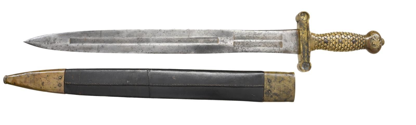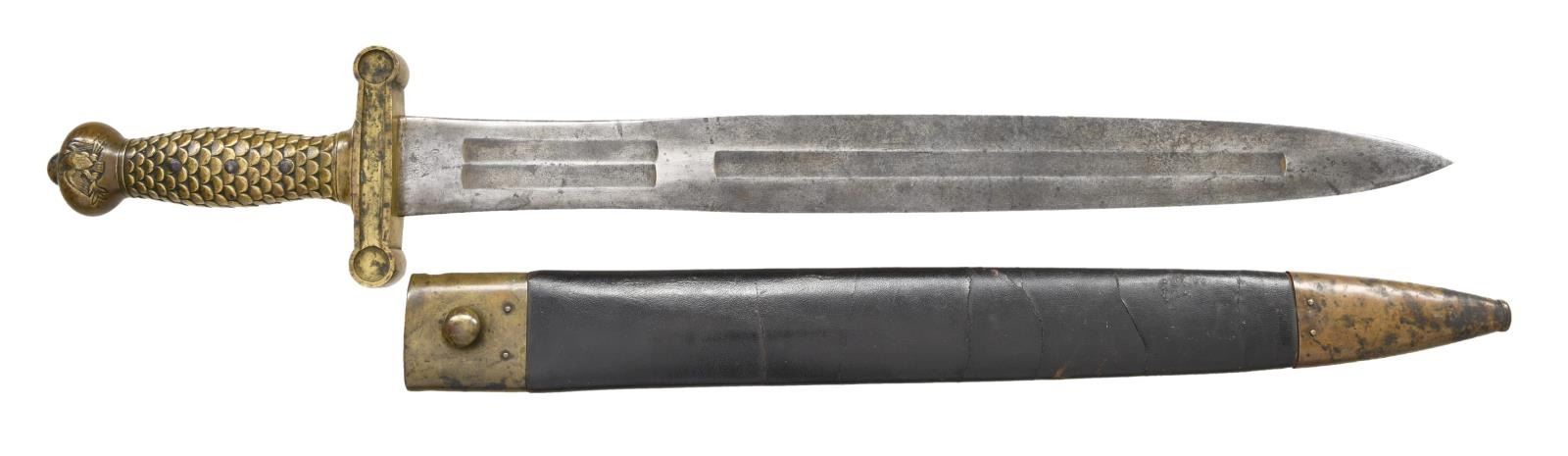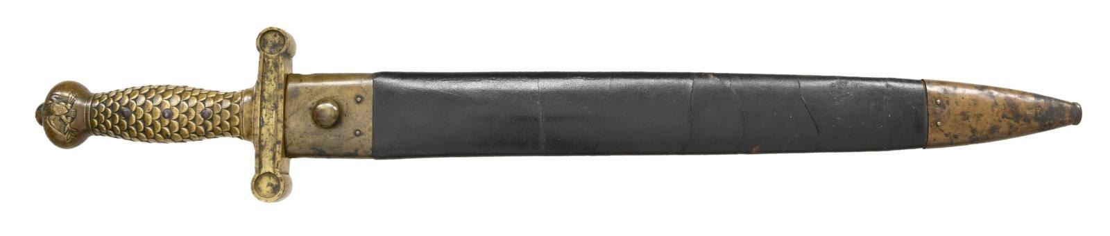 Overall length: 26". Blade length: 19 1/4". Plain blade with a 10 1/4" fuller atop two 3 3/8" fullers. Blade is marked at the ricasso "(eagle) N.P. AMES CABOTVILLE" on one side, and "US. 1845 NWP" on the other. Solid brass hilt with simple crossguard. Eagle impressed pommel with fish scale grip. Grip has 3 iron rivets. Brass mounted leather scabbard. CONDITION: blade has a medium gray patina. Hilt has an overall deep mellow patina, as does the mounts on the scabbard. Leather is slightly crazed & flexed but remains very strong. PROVENANCE: From the Collection of James B. Taylor. (02-19879 /BF). $600-800.