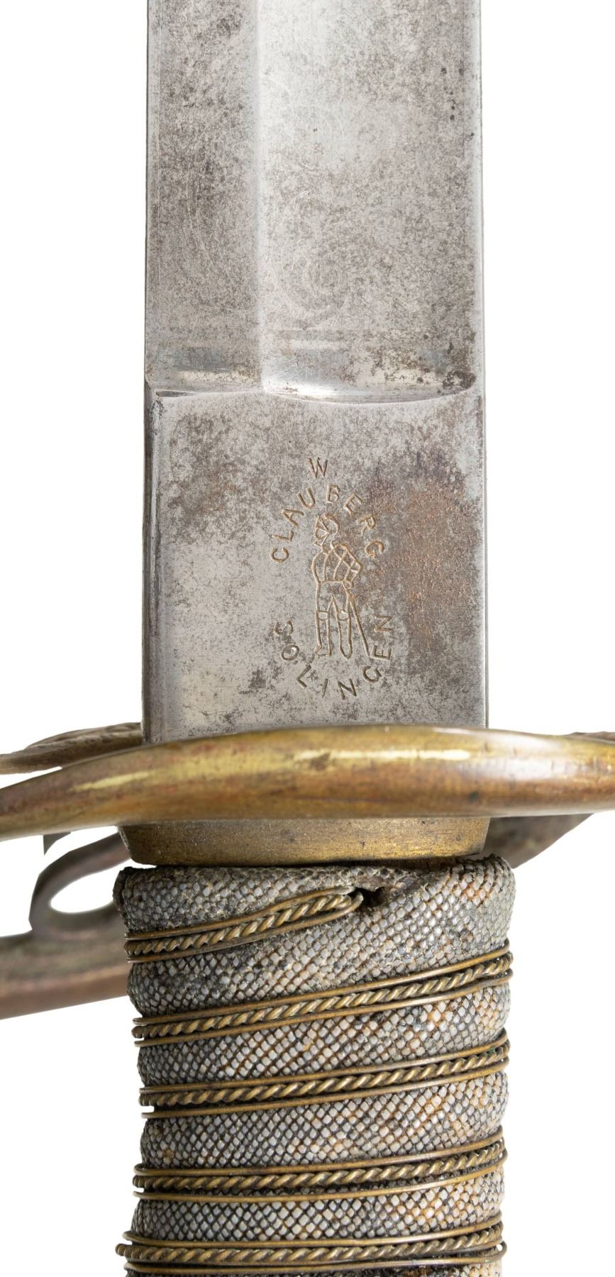 CLAUBERG. A good example of a US M1850 Staff & Field officer's sword measuring 39 1/2" overall with an etched 32" blade. The blade has a single large fuller with a secondary fuller near the spine. It etched with a large American eagle on one side and a large "US" on the other. The ricasso is marked " W CLAUBERG (logo) SOLINGEN ". Gilded brass hilt with a pierced floral decorated guard featuring a large cutout "US". Wire wrapped sharkskin grip. Gilded brass mounted brown finished iron scabbard. CONDITION: blade has a light gray patina with some oxidation spots. Hilt is undamaged and retains traces of its original gilded finish. Wire and grip are complete. Scabbard mount retain traces of gilding and the browned finish is about 70%. (02-24166/BF). NON-GUN. $700-1,000.