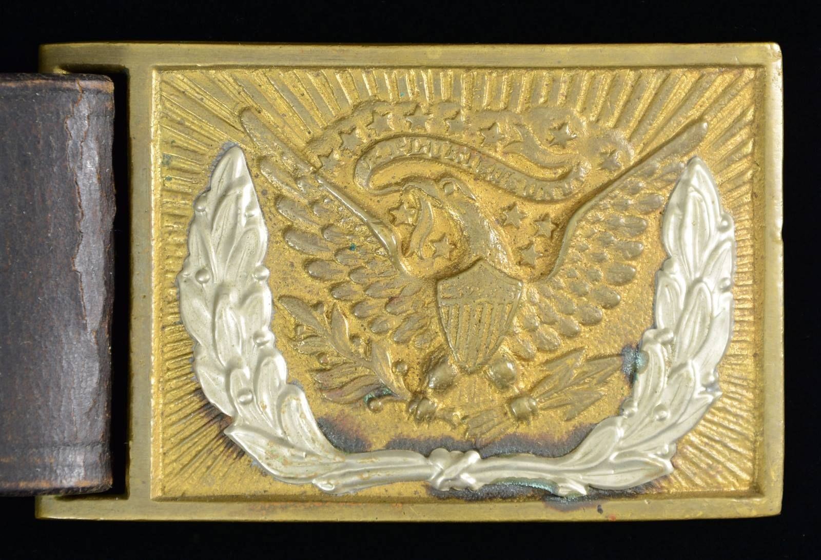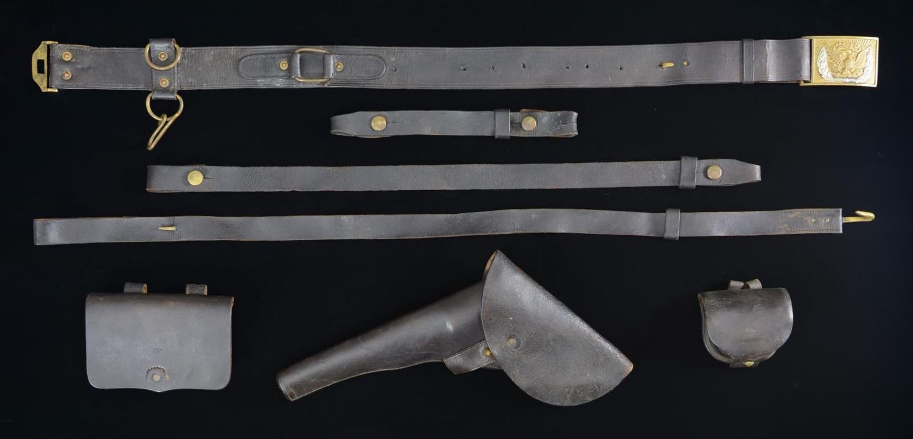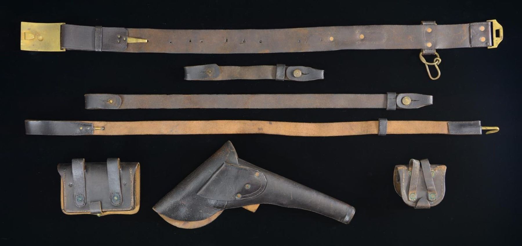 APPROPRIATE BOXES. This rig consists of an M1851 cavalry black bridle leather belt with saber hangers and an over-the-shoulder sling. The buckle has an applied silver wreath and fits the keeper quite well, although the numbers on the back of the keeper and plate are different. The belt is accompanied by a black leather holster for a Colt M1860 Army revolver. The holster is marked on the inside “J. CUMMINGS. SPRINGFIELD. MASS.” and the outside has a large stamp that reads “78K”. There is also a Civil War period black bridle leather pistol cartridge box, marked on the outside flap “J. DAVY & CO NEWARK N.J.” along with a script “US” stamp and an inspector’s cartouche for T. Shepard. Lastly, there is a black bridle leather cap box without interior wool, but the pick is present. The box is marked on the outer flap with “U.S. WATERVLIET ARSENAL”. UNATTACHED ACCESSORIES: please see page 754 of the Meadows book for similar examples. A copy of this page is included with the lot. CONDITION: black bridle leather belt is quite solid, with minor flexing and flaking. Holster shows general light wear, as do the pistol box and cap box. PROVENANCE: The Collection of Edward Scott Meadows. (02-22068/BF). $1,000-1,500.