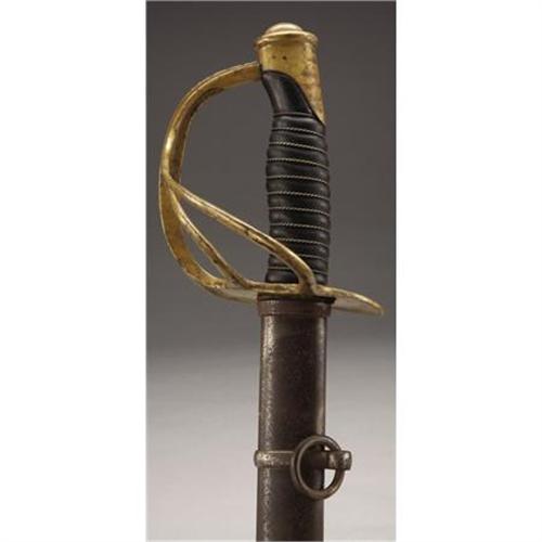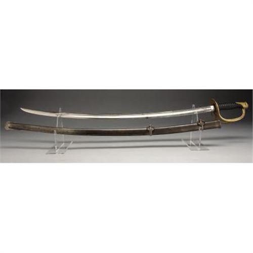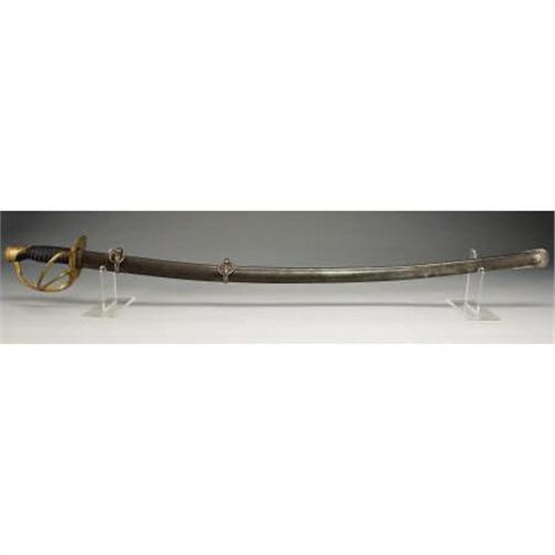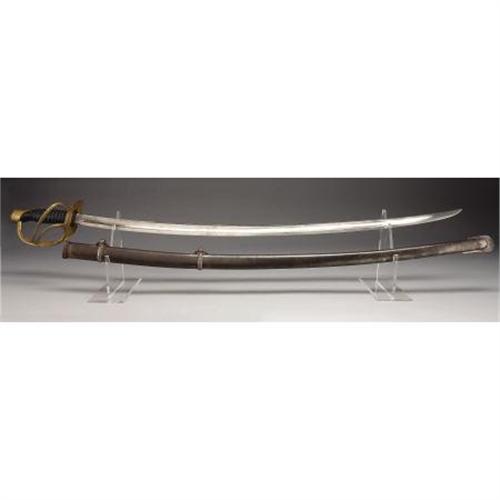 <B>U.S. M1860 LIGHT CAVALRY SABER WITH INTERESTING PERIOD ID.</B></I> Standard M1860 light cavalry in every respect but completely unmarked, no maker or inspectors, and clearly made this way. Neatly scratched on the back of the knuckle bow and unquestionably period, “W. M. E. U. S. R. I.”, most intriguing. An unusual M1860 light cavalry with interesting ID and superb condition. <BR><BR><B>Condition: </B></I>Completely untouched. Blade near mint. Brass hilt with nice patina, perfect. Grip with original leather and twisted brass wire wrap, also perfect. Steel scabbard excellent with overall smooth dark patina. Just some negligible surface rust and a few dents on the back near the drag. Drag with some light pitting and wear on the bottom from being carried.<BR><BR><BR><b>Shipping:</b> Requires 3rd Party Shipping (<a target="_blank" href="http://www.heritageauctions.com/common/shipping.php">view shipping information</a>)
