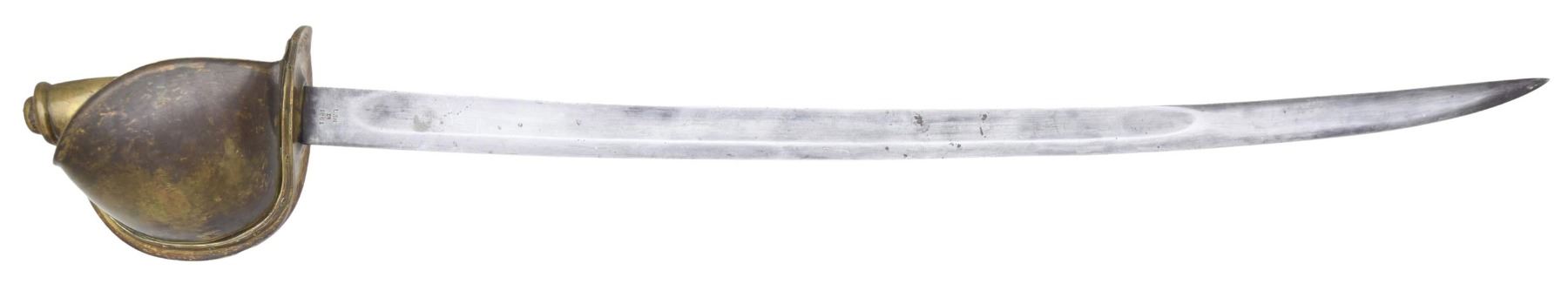 Overall length: 32". Blade length: 26". The plain blade has a single wide fuller and is stamped at the ricasso "U.S.N. DR 1861" and "Made by AMES MFG CO CHICOPEE MASS." Full, brass, cup-shaped guard with standard pommel. Wire-wrapped leather grip. No scabbard. CONDITION: blade has a medium gray, cleaned patina. Hilt has a mellow, mustard patina. Grip leather is better than 95%. Wire is complete. (02-23278/BF). $400-600.