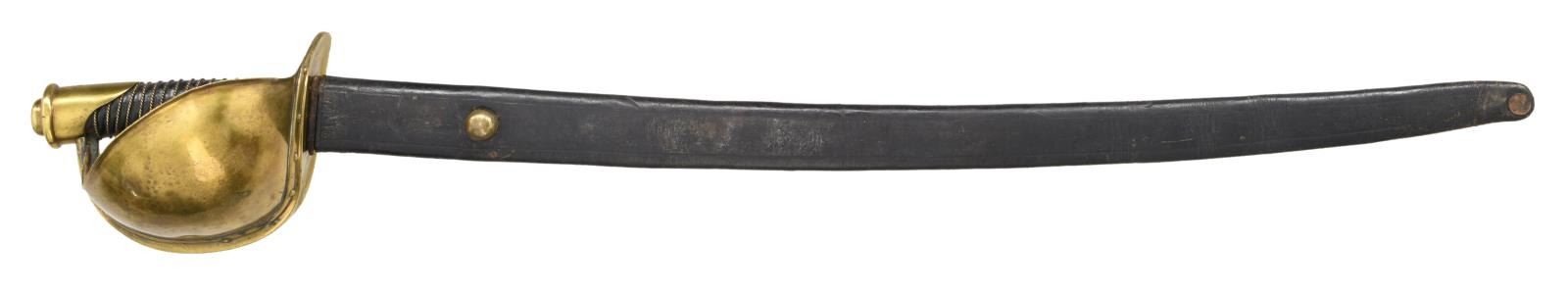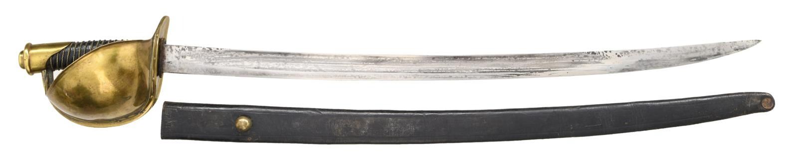 Overall length: 32". Blade length: 25 1/2". Plain blade with a single wide fuller. Blade is stamped at the ricasso with an anchor over "P". The blade appears to have been plated possibly with chrome. Brass hilt with full cup guard. The guard is stamped in the quillon area "24M 273". Wire wrapped leather grip. Leather scabbard with copper rivet construction. CONDITION: plated blade has been sharpened and is starting to lose plating. Blade also appears to have been rehilted. Guard has a polished lacquer finish. Grip has been rewrapped with wire added possibly at an arsenal. Leather scabbard is flexed but unbroken. PROVENANCE: From the Collection of James B. Taylor. (02-19880/BF). $400-600.