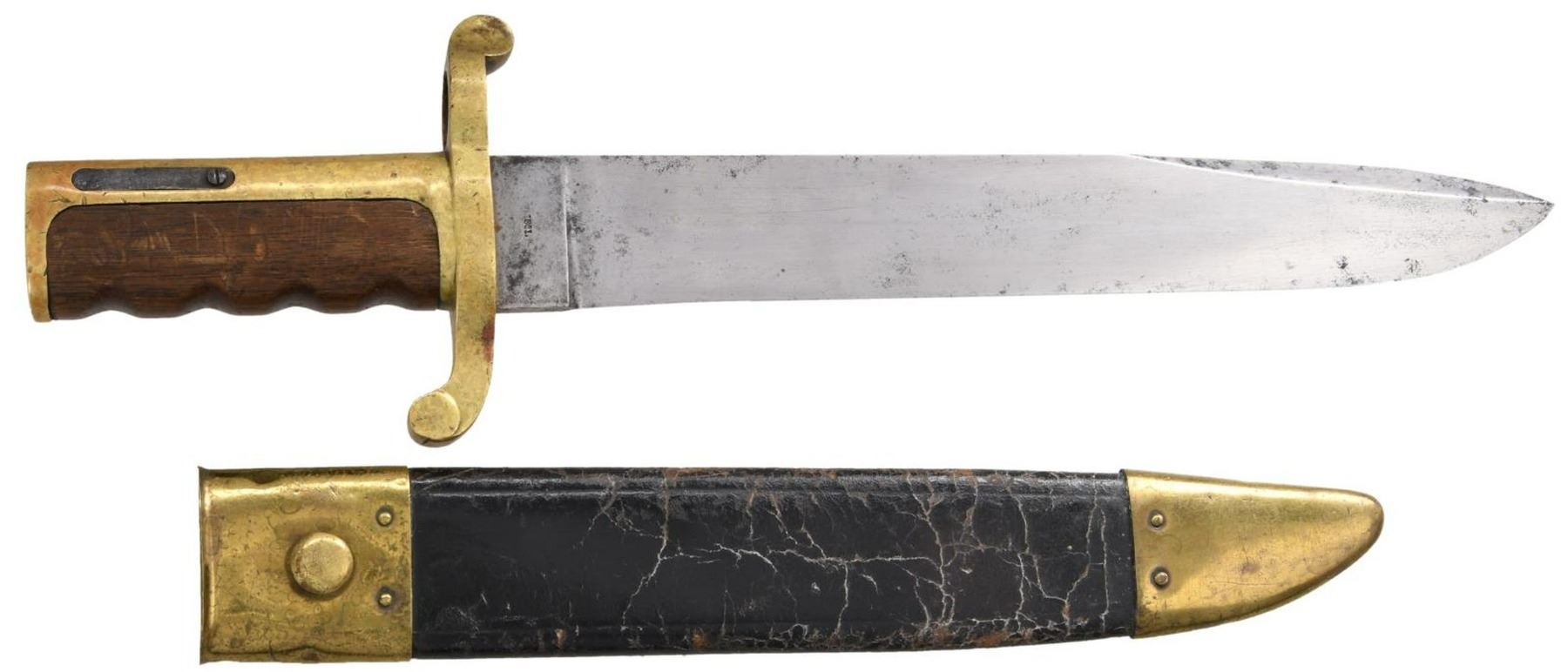 This bayonet was for the Plymouth Whitneyville Navy rifle, but is commonly called the “Dahlgren bayonet”. The bayonet was designed to be useful both at the end of a rifle and for hand-to-hand combat. The bayonet itself has an overall length of 17 3/8” with a blade length of 12”. The plain blade has a 5” false edge near the tip. The ricasso is stamped “AMES MFG CO CHICOPEE. MASS.” on one side & “1861.” on the other. Heavy brass hilt, including a crossguard with barrel ring in a rudimentary “S” shape. 1-Piece wood grip. Iron spring. Brass-mounted leather scabbard. CONDITION: blade has a light gray patina with scattered staining. Hilt has a pleasing mustard patina. Wood shows noticeable wear. Scabbard is solid but does have crazing. (02-21218/BF). $1,000-1,300.