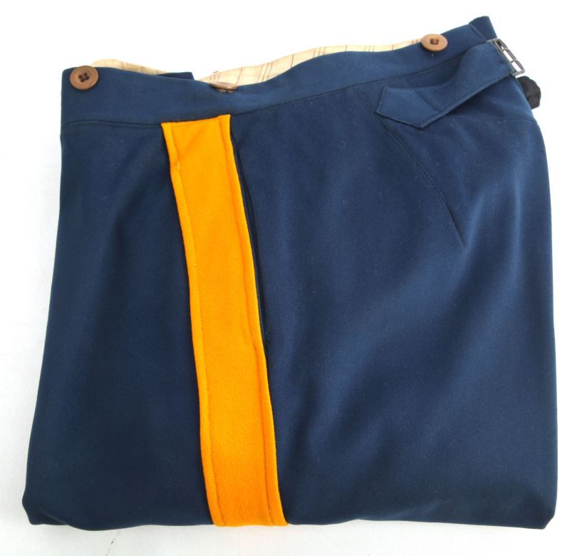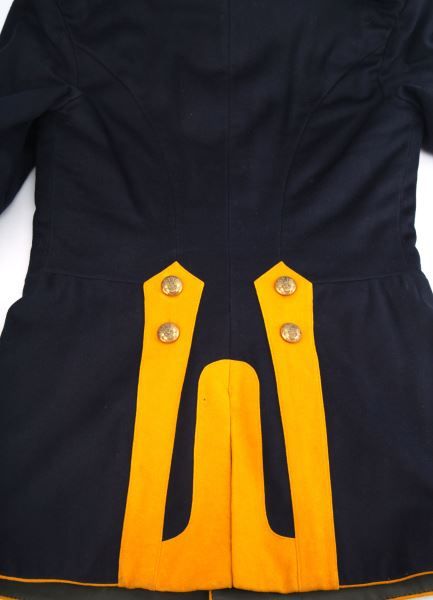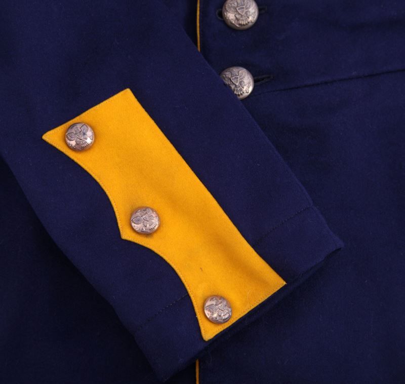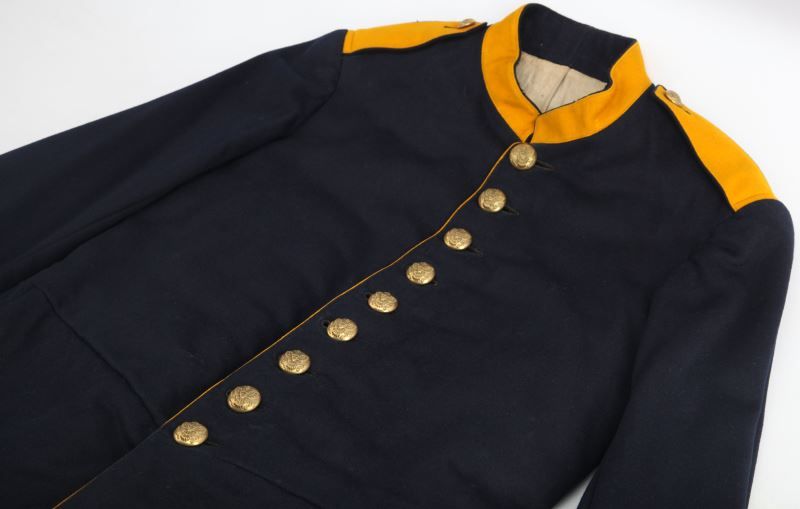 US M1885 tunic, blue wool body, with brass eagle buttons and yellow border trim. overall very good condition, with minimal mothing.