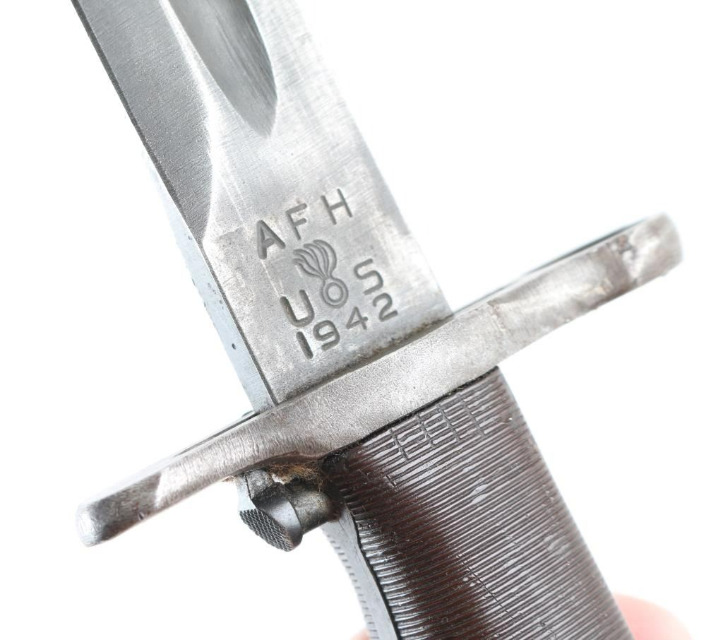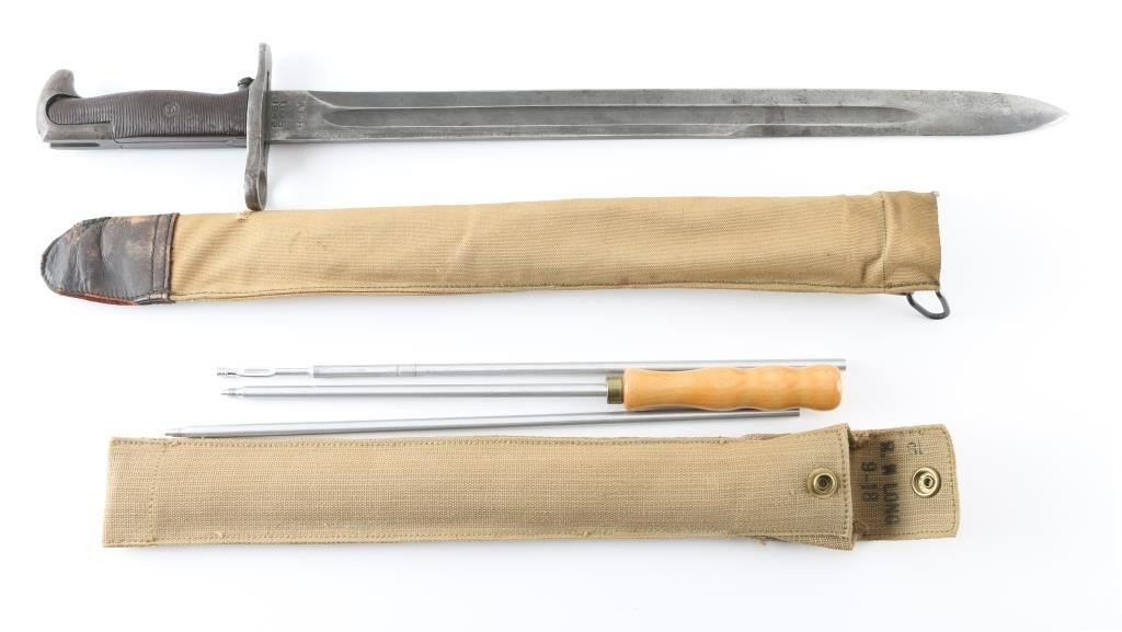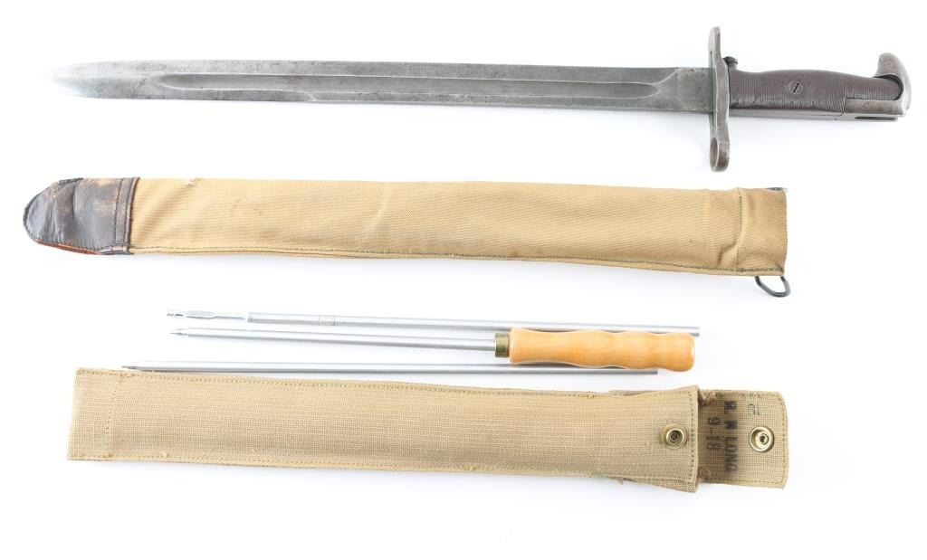 type IV model of 1905 (M1942) with 1942 date, made by American Fork & Hoe, fits Springfield 03's or M1 Garand rifles. 15.75" blade, 20.5" overall, parkerized finish with dark brown plastic or bakelite scales. Good condition, with much bare metal showing. Includes a canvas M1905 outer sheath, no interior wood present, leather end tab shows distress, canvas is good with minor condition issues, wire hanger appears new. Also with this lot is a khaki canvas cleaning rod pouch, marked "R M Long 9-18", in excellent condition, either unissued or a very good reproduction, holding a three piece aluminum cleaning rod with wood handle.