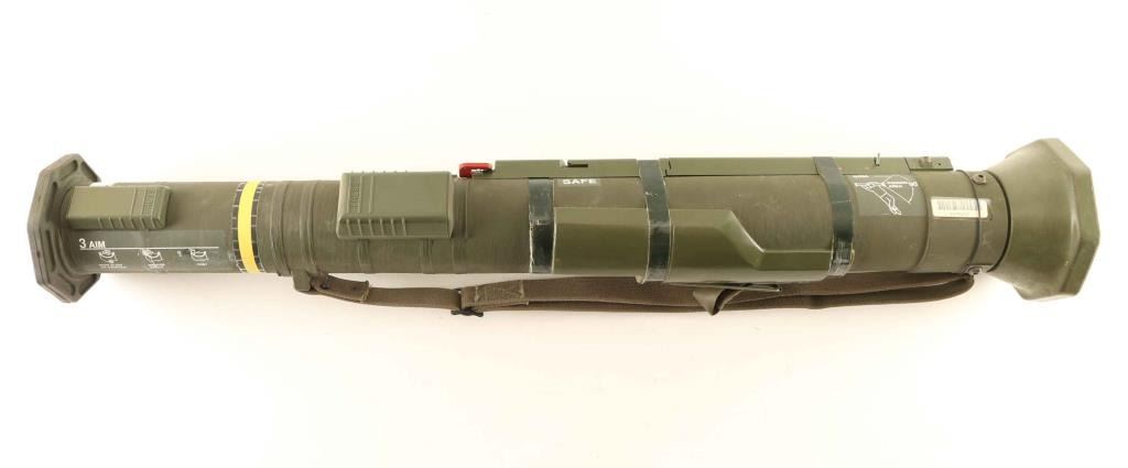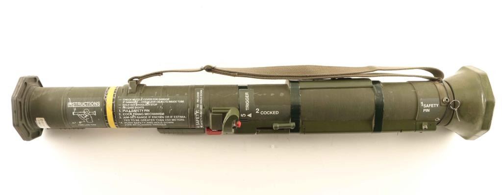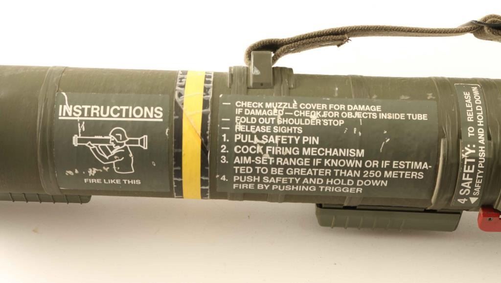 US M37 At4, unguided, anti-tank, rocket launcher. 84mm. Portable,single-shot, recoilless , smoothbore. developed in the 1980's. OD green, with all the instruction labels intact. Original web sling. This is a one-shot disposable weapon. Cannot be reloaded. Grat display piece.