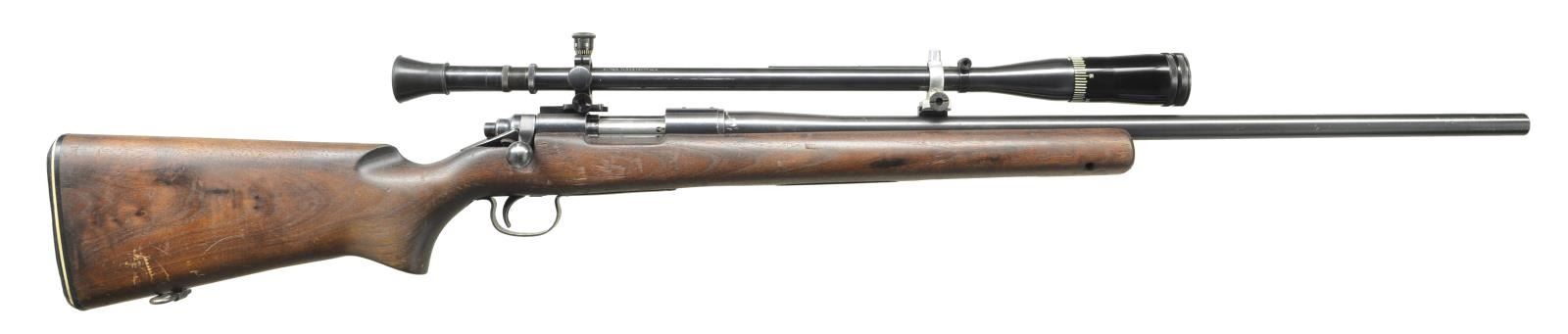 Cal. 22 LR. S# 4496. Bbl. 28" standard tapered target weight. Lyman Super Targetspot 15X target scope with crosshair reticle on barrel blocks. Single shot action. Left side is marked "U.S.M.C. PROPERTY / 22 LONG RIFLE". Walnut target stock with accessory rails in forearm, rear sling swivel and White Line thin black pad. Pistol grip is stamped "6667". Weight: 11 lbs., 5.8 oz. with scope. Barrel date code appears to be "P F" which indicates June, 1985 mfg. CONDITION: 80% lightly worn blue showing wear and handling marks. Stock has heavily worn appearance with numerous dents, gouges and marks. Bore retains sound rifling. Scope has good optics. (22-4774/DS). MODERN. $1,200-1,800.