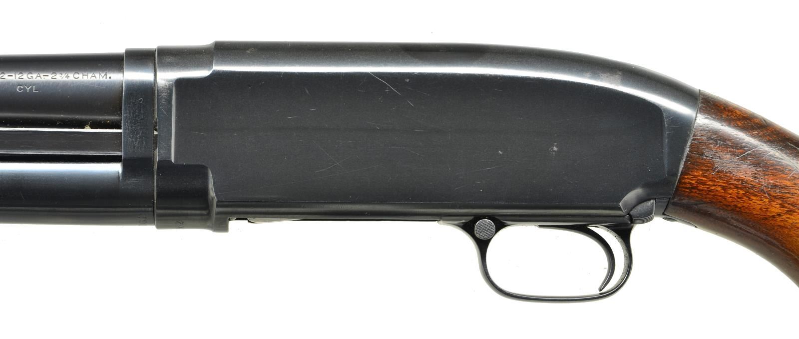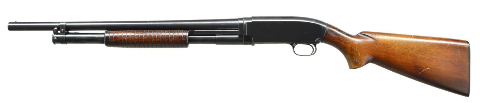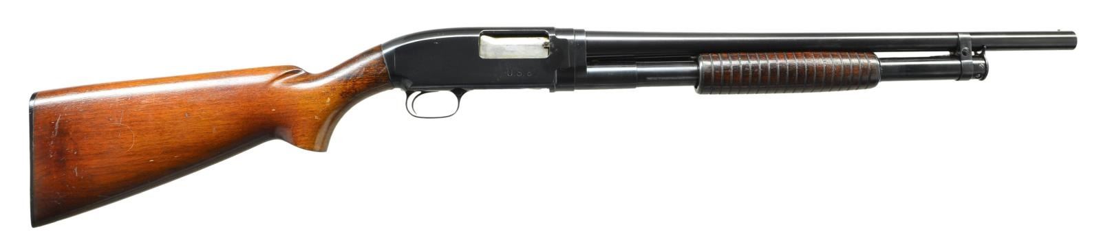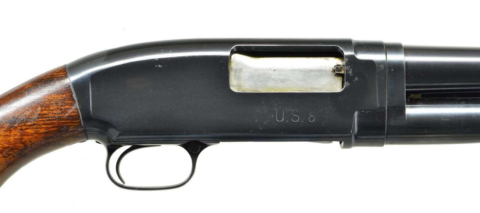 SHOTGUN. Cal. 12 ga., 2 3/4". S# 967062. Bbl. 20 3/4" plain with factory Cyl. choke and steel bead. Top of barrel is marked with flaming bomb ordnance mark. Right side of receiver is stamped "US" followed by flaming bomb. Small round grooved forearm and pistol grip stock with original buttplate. Mfg. 1943. CONDITION: over 97% nicely polished reblued finish with weakened "US" markings. Forearm has age darkened lightly worn original finish. Original stock finish shows darkening at head with wear spots, scratches and marks. Barrel adjustment ring is taken up one notch. Very good bright bore. (22-4427/DS). CURIO. $800-1,200.