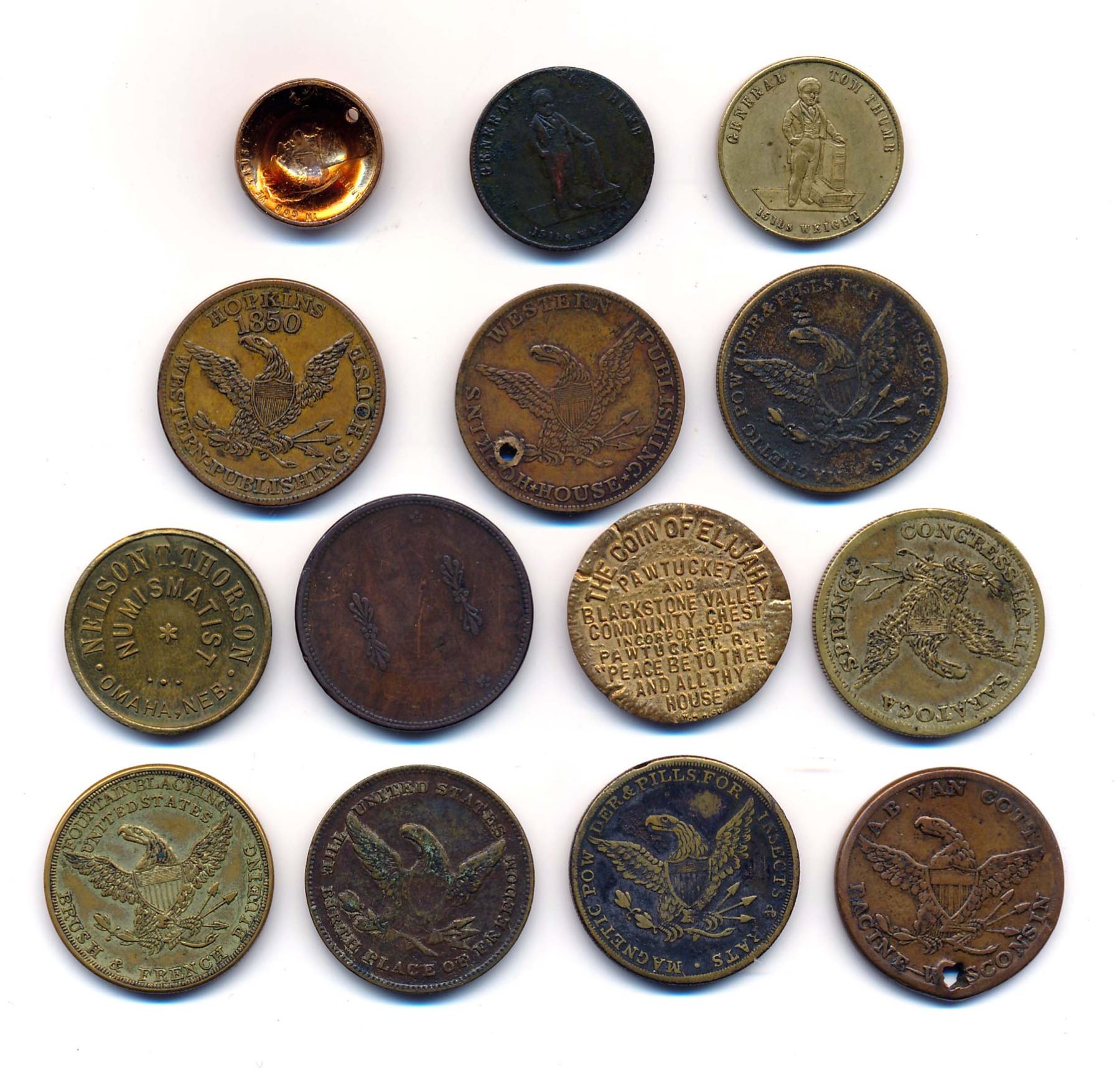 Mostly US 10.00 Eagle design except 2 x 1852 Ralau NY-19 Tom Thumb in brass and copper and a 1941 Lincoln Cent domed and pierced. 2 pieces are holed
