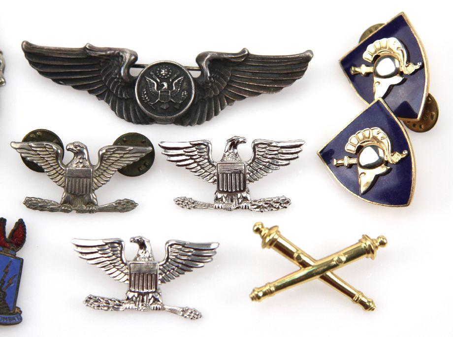 Lot of various US Military insignia to include DUI's, crossed cannon, 3 Colonel rank insignia (sterling 19 g), aviators wings (sterling 20.4 g), badge marked "IDENTIFICATION OFFICER / GUARD", with Army Air Corps insignia at bottom.