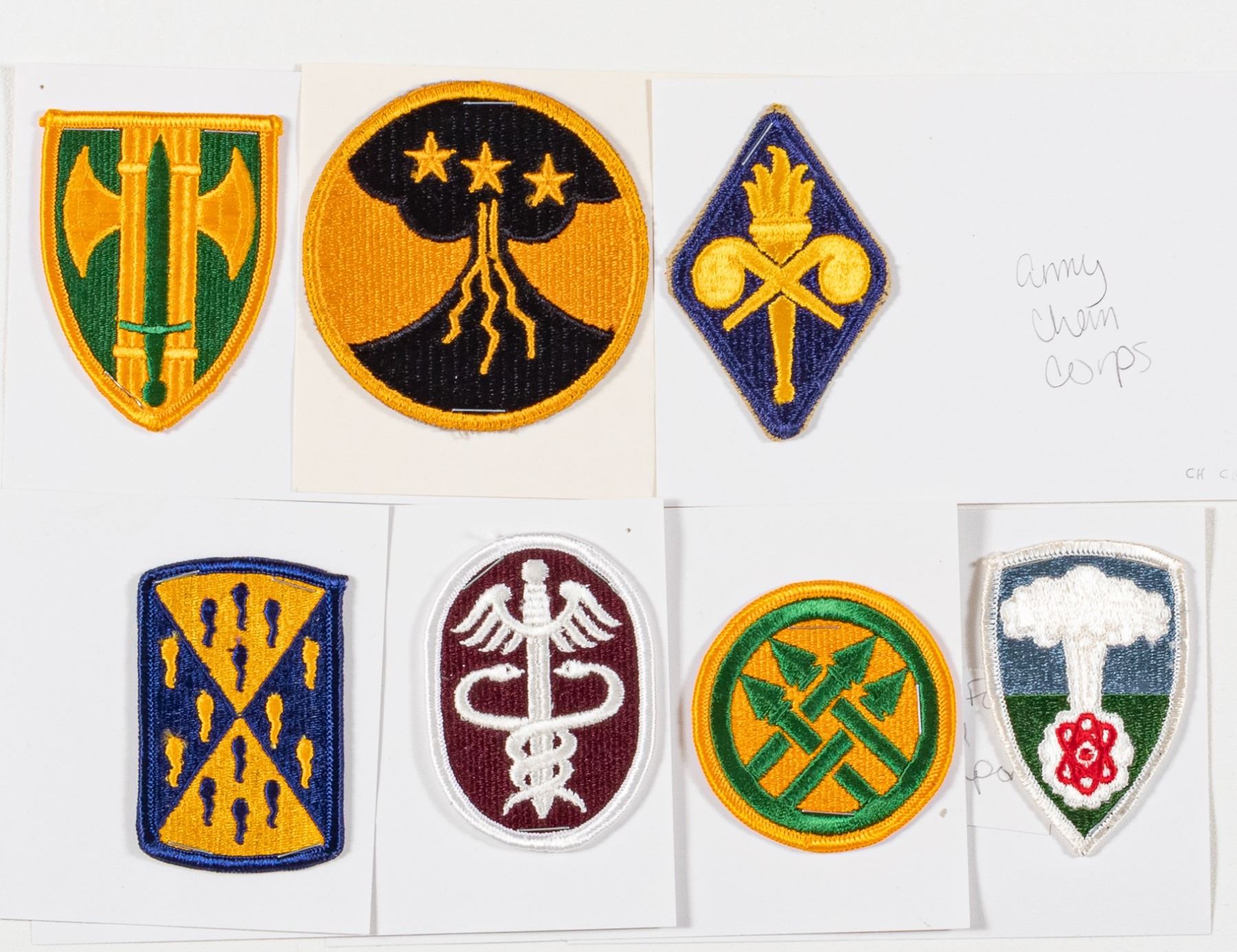 Lot of seven US military patches of 18th Military Police Brigade, 220th Military Police Brigade, 464th Army Chemical Brigade, Philippine Battalion, Army Chemical Corps, Army Medical Command, and Armed Forces Special Weapons. Stapled to index cards.