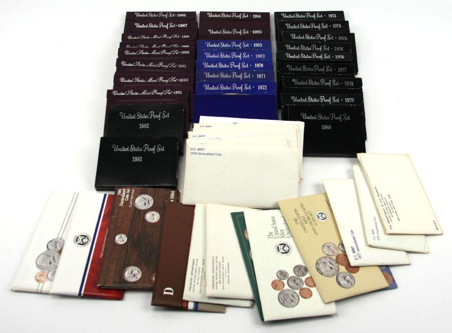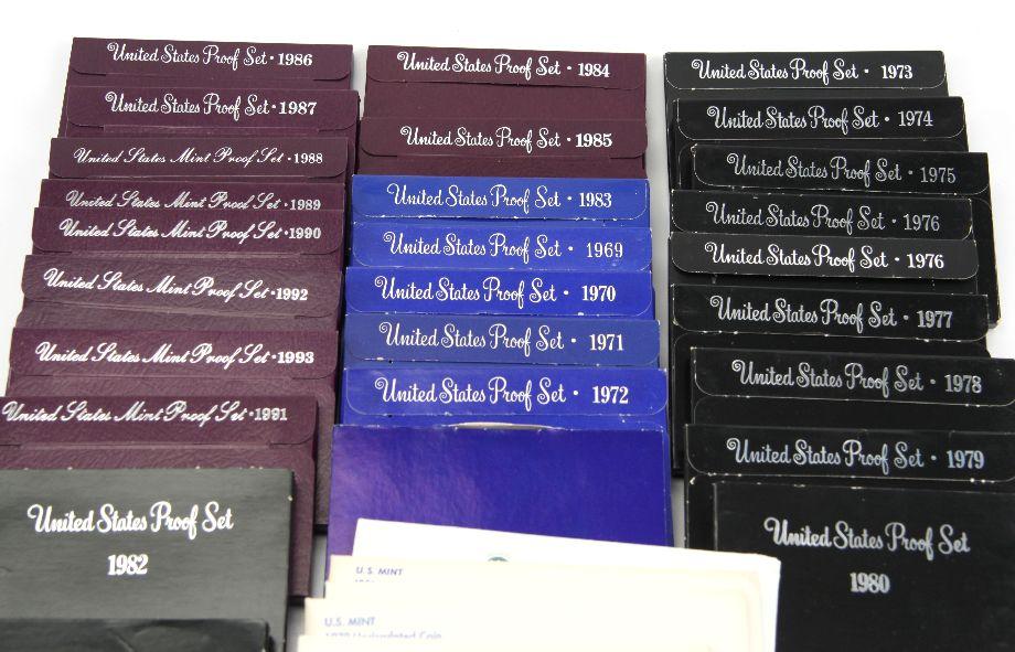 A collection of Proof sets as issued by US Mint all with COA. Years; 1968-1993 single set per year with the exception of two for 1976. Uncirculated sets dating 1970-1981 and 1984-1993 one per year. A total of 48 sets.