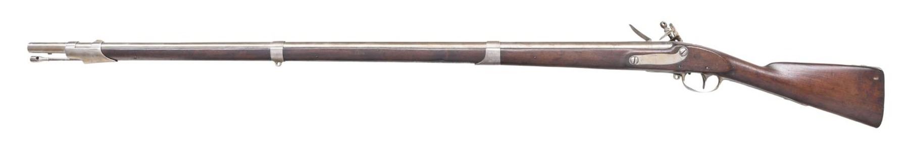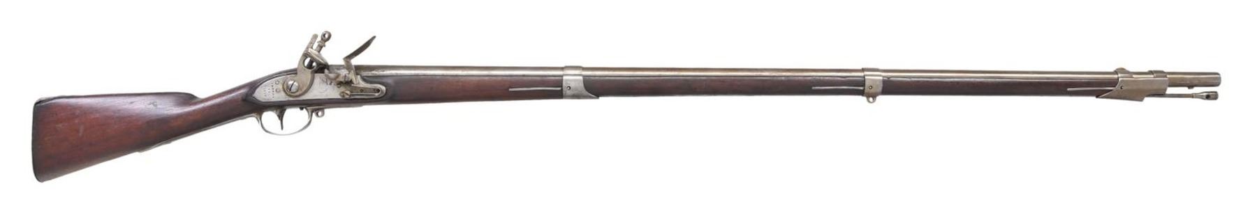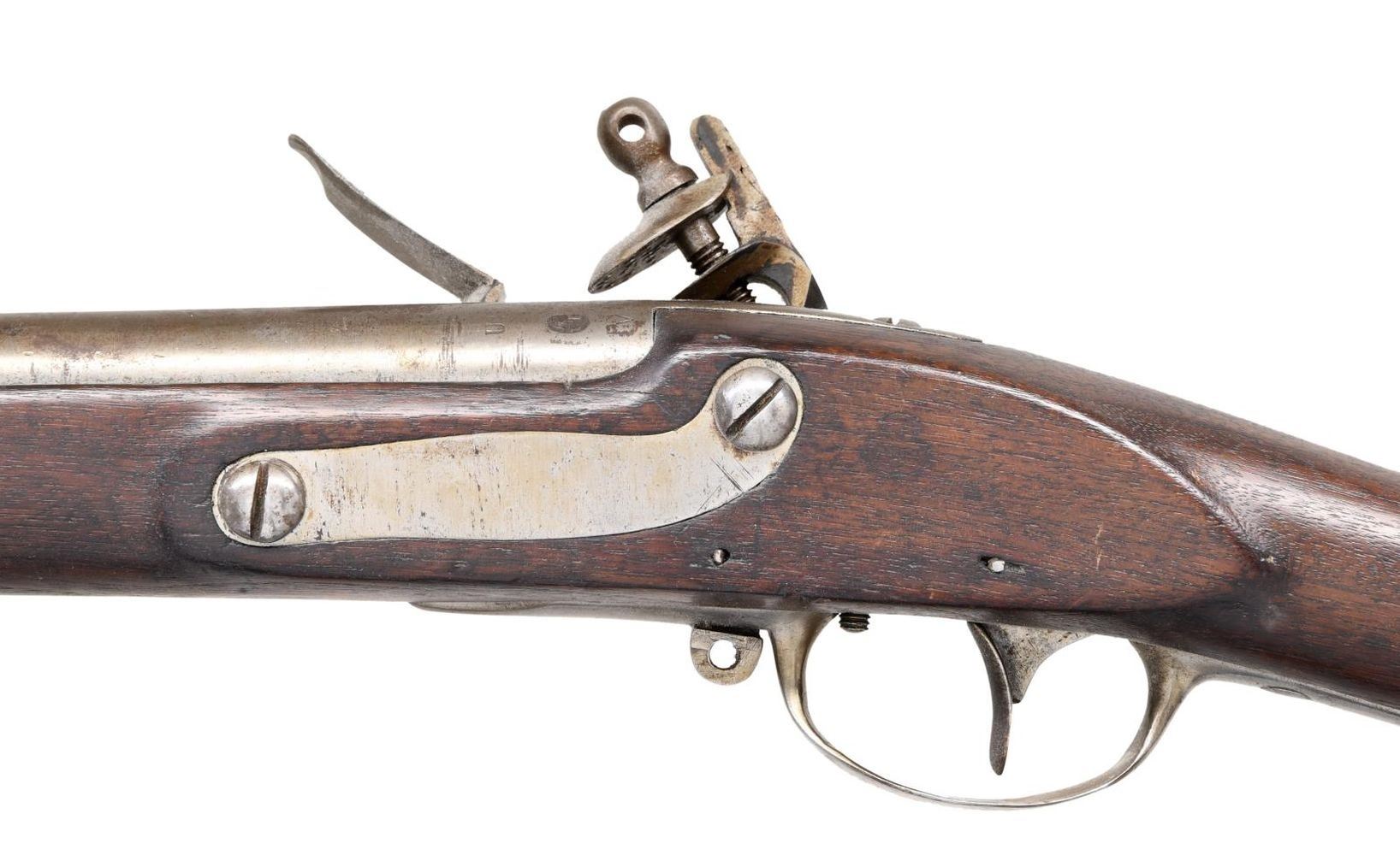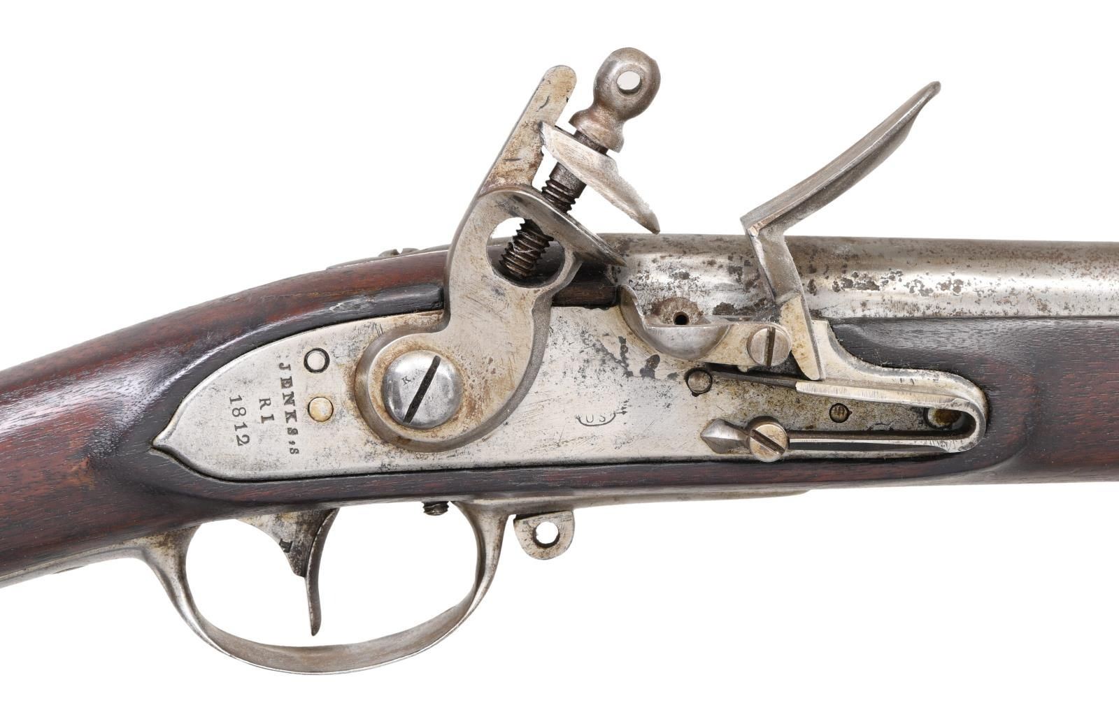 SONS RECONVERTED. Cal. 69. S# NSN. Standard configuration with a 44-1/2" barrel. Jenks had a contract for 4,000 muskets, with 3,925 believed to be delivered. The barrel is stamped "US" over a "CT" eagle head oval cartouche over "V.". The federal contract-marked lock has "US" in front of the cock, and the rear is marked vertically "JENKS, s", "RI," and "1812". Walnut stock with iron mounts has remnants of inspectors marking on the left side. CONDITION: fair to good. The metal was cleaned to silver over considerable pitting. Stock sanded and refinished, edges rounded. Rusted bore. Reconversion works fairly well. (01-24442/MGM). ANTIQUE. $800-1,200.