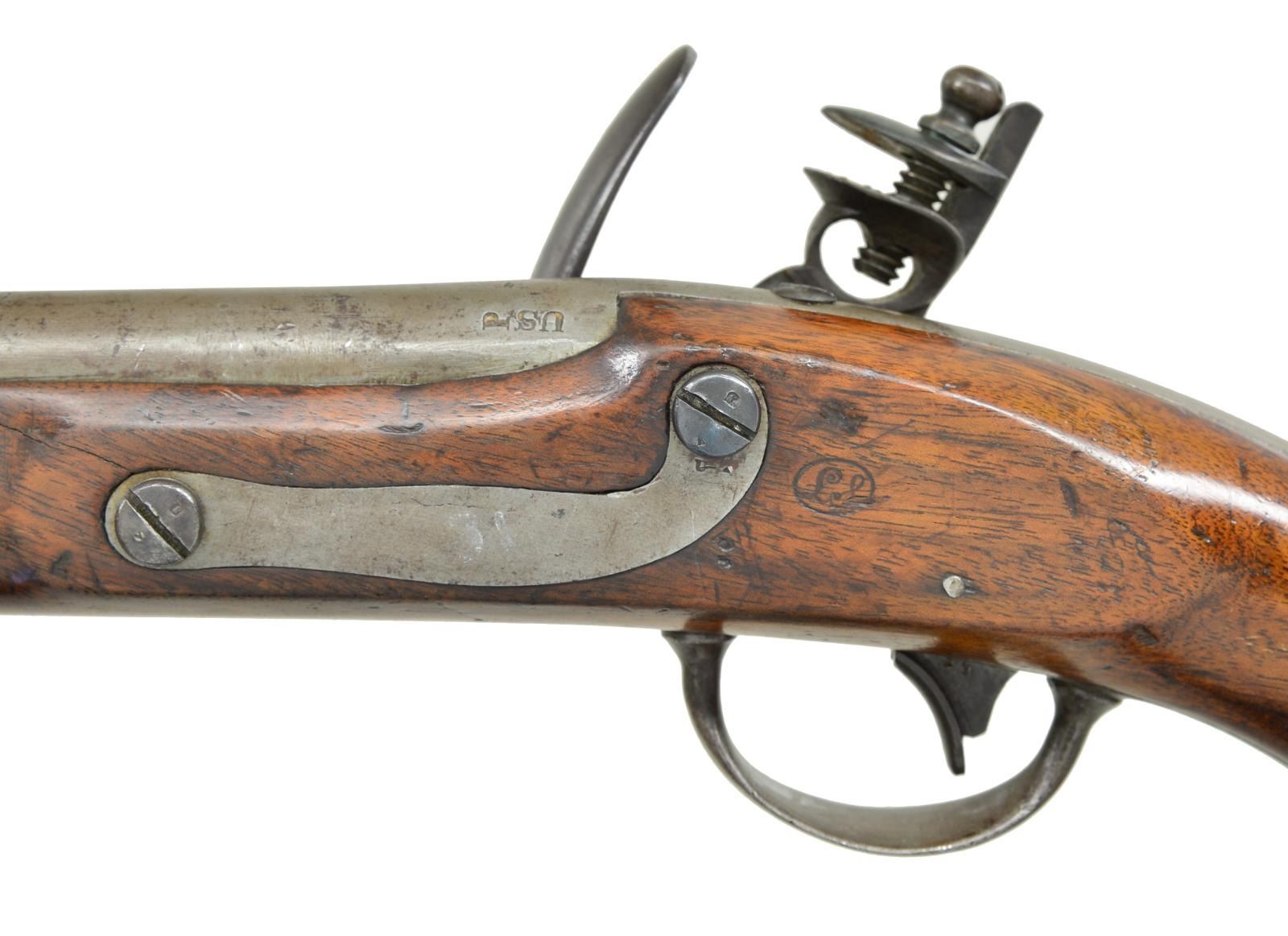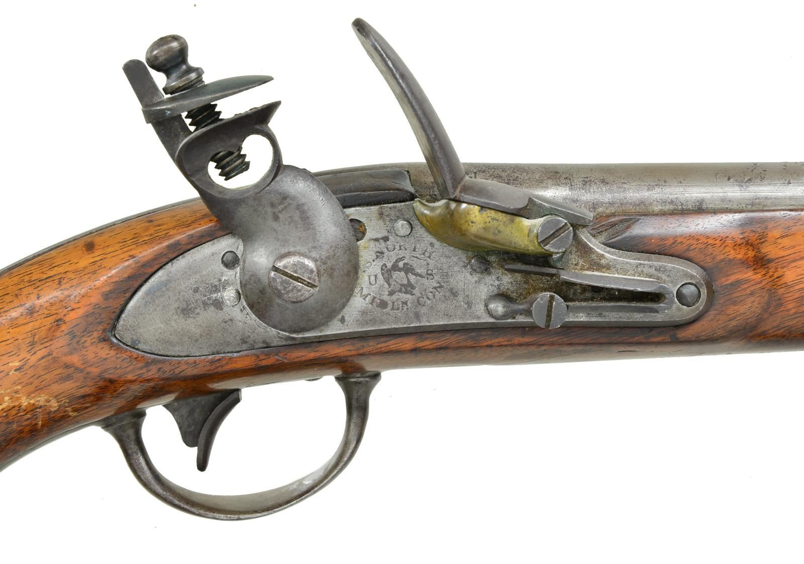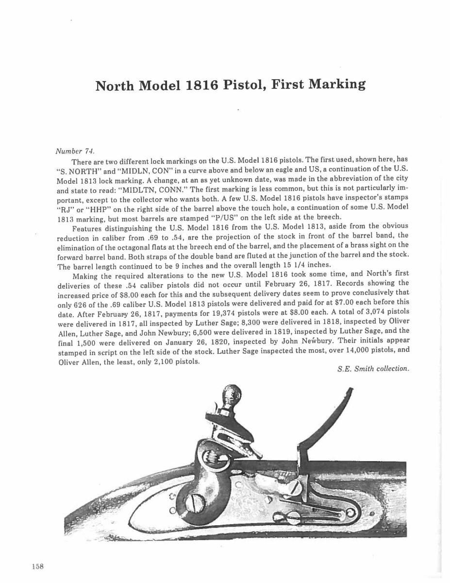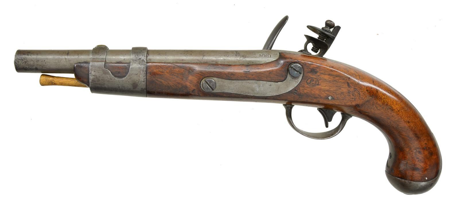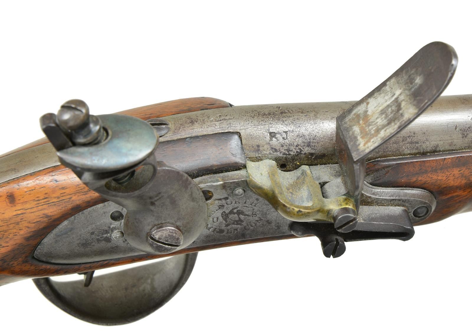 54 Cal. NSN. Standard configuration. 15.25" overall, 9” barrel proofed “P / US” at breech and “RJ” over touch hole seen only on earlier production double strap band with brass sight. Lock is marked “S. NORTH / US (w/ eagle) / MIDLN CON”. Stock has “LS” (Luther Sage) cartouche. This is a good solid original flint example of the first American 54 cal martial pistol following 69cal model 1813 with longer barrel and now sighted. This model was beginning of line of 54 cal martial dragoon pistols culminating in last model 1842 prior to martial Colt revolvers. CONDITION: very good overall. Appears complete & matching w/ exception of top jaw, top jaw screw, & replacement ramrod. Markings very good and well struck & discernible. Metal overall has gray/dark iron patina w/ pitting. Mechanically fine, clear smooth bore. (01-21464/JS). ANTIQUE. $1,500-2,000.