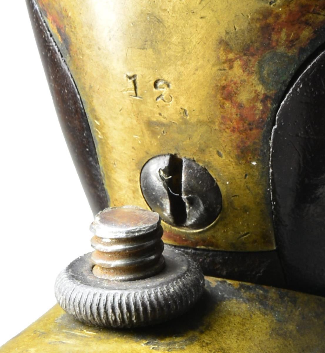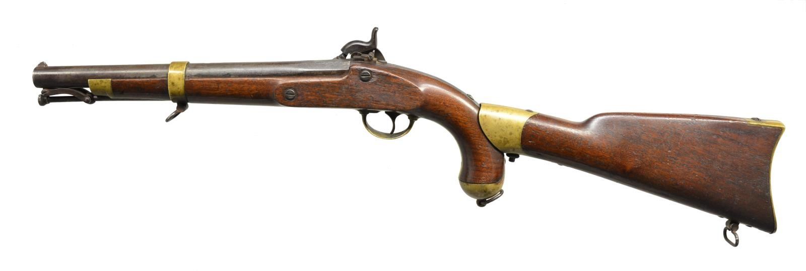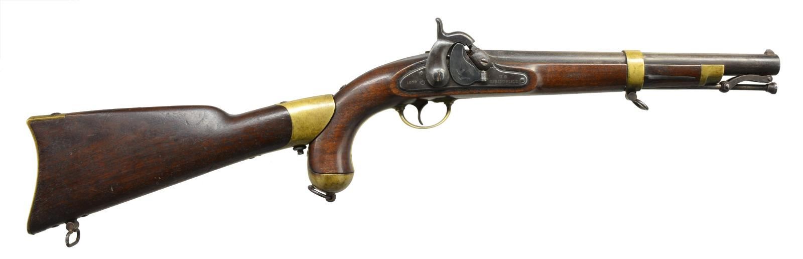 SHOULDER STOCK. Cal. 58. NSN. 12" Rifled bbl. is fitted w/ swivel mounted steel ramrod. “V” & eagle head proofs are visible on top left flat at rear. Bbl. tang is fitted w/ 2 leaf folding rear sight, 1 leaf w/ dual V notches, & front leaf w/ peep aperture. 1855 Dated percussion lock is fitted w/ tape priming device & is marked “U.S. SPRINGFIELD” at front. An eagle stamp is on priming cover. Back strap is cut for attachable stock. Stock is brass mounted w/ 1 spring retained brass band to attach bbl., brass nose cap, trigger guard that extends to rounded butt cap w/ iron lanyard ring. Cap is stamped “19”, matching size & font of number on tang of detachable walnut stock, “US” is stamped on top of brass buttplate & a sling loop is on brass mount at toe. CONDITION: good to very good. iron parts mostly gray patina w/ considerable pitting at rear portion of bbl. Tape primer cover is a replacement. Good bore. Lock & tape primer operable. Stock sound w/ old hand worn finish. Brass nicely patinated. Inspectors mark on left side not quite legible. Buttstock matches exceptionally well. PROVENANCE: The Estate Collection of Gary Parietti. (01-19069/MGM). ANTIQUE. $3,000-5,000.