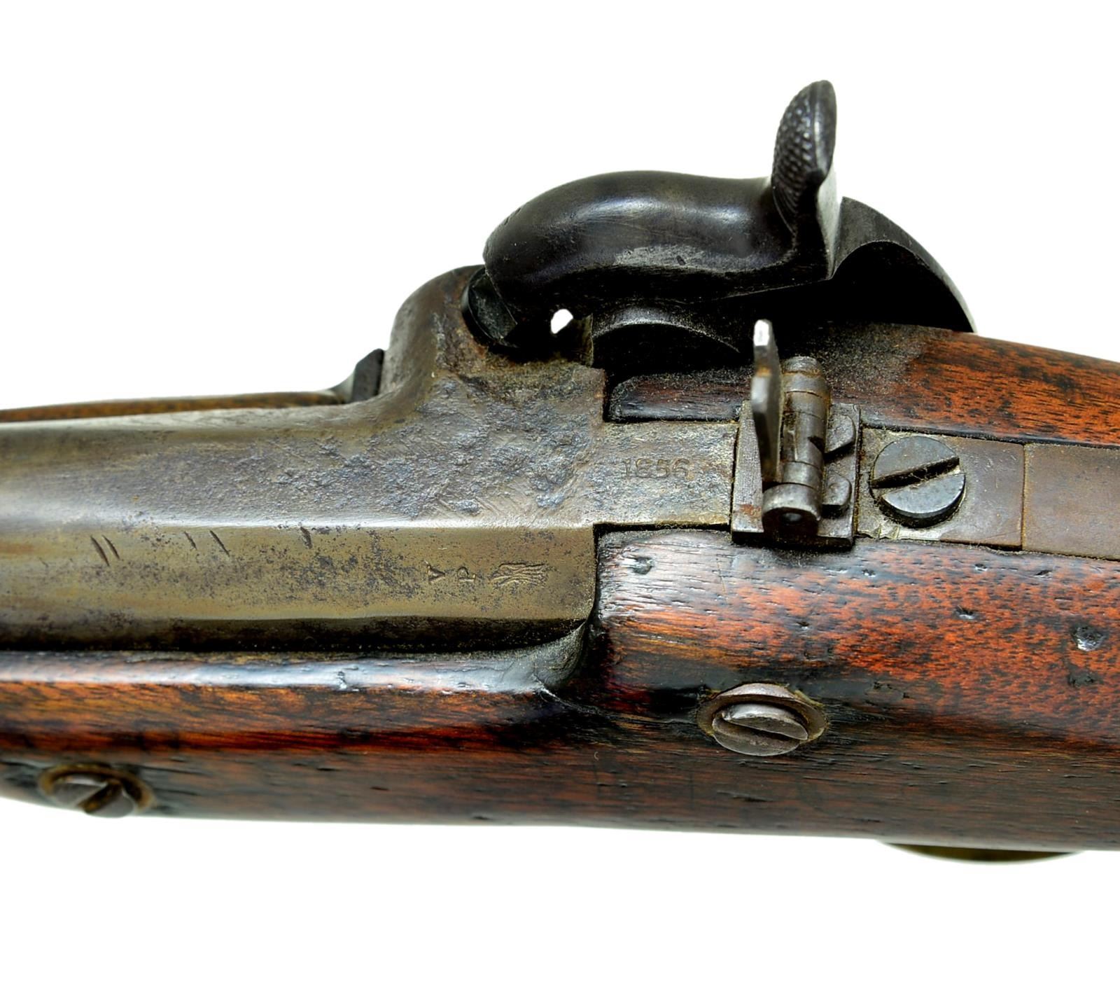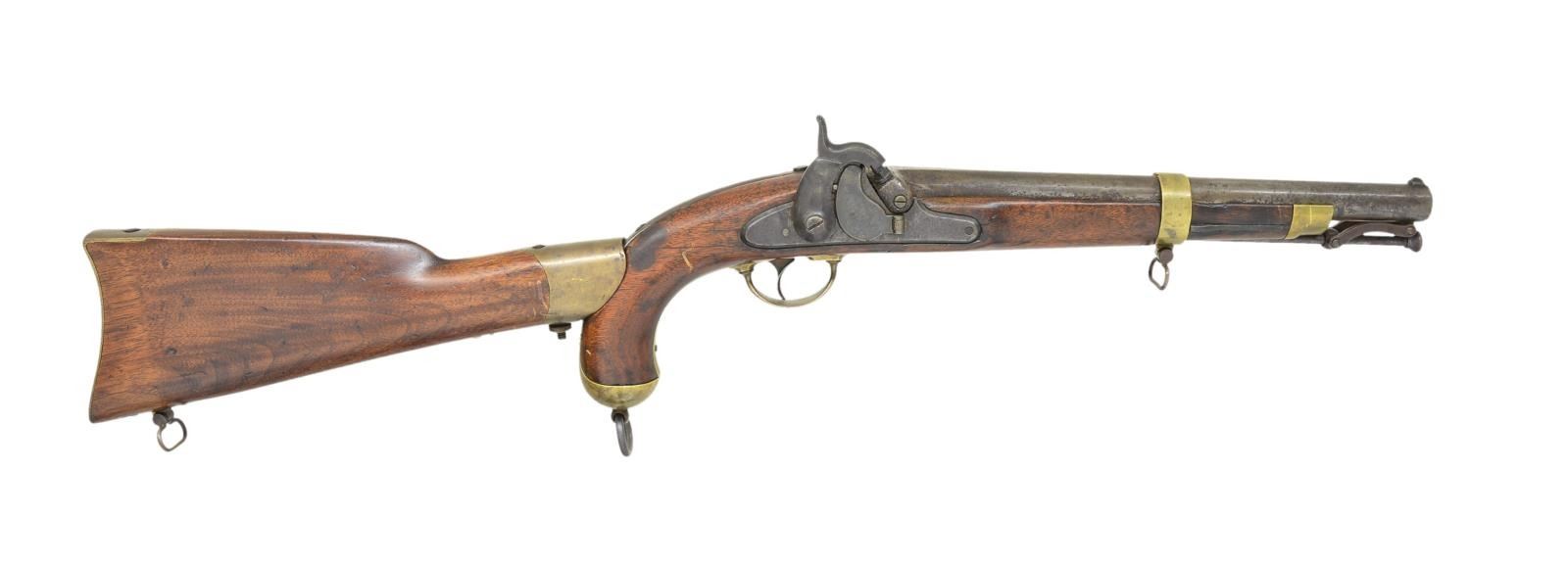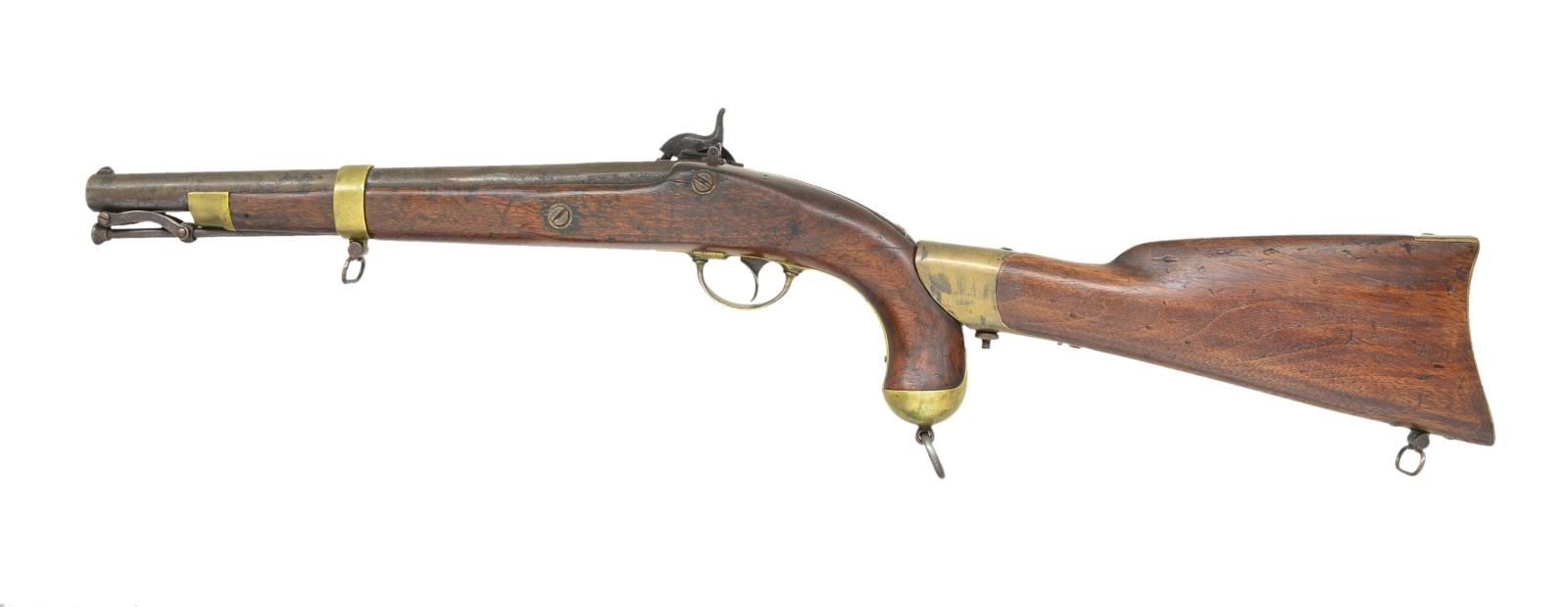 Cal. 58. NSN. 12" 1855 dated barrel with “V P / eaglehead” proof. Detachable stock has "US" surcharge on buttplate. Though obsolete by 1860s, early Civil War photographs of U.S. & Confederate soldiers often show these unique carbines. CONDITION: good overall. Assembly number on pistol is "13". "18" is assembly number on stock yoke, wood & buttplate appear to be restorations. New nipple. Mechanically functional, good rifled bore. (01-19416/JS). ANTIQUE. $1,500-2,000.