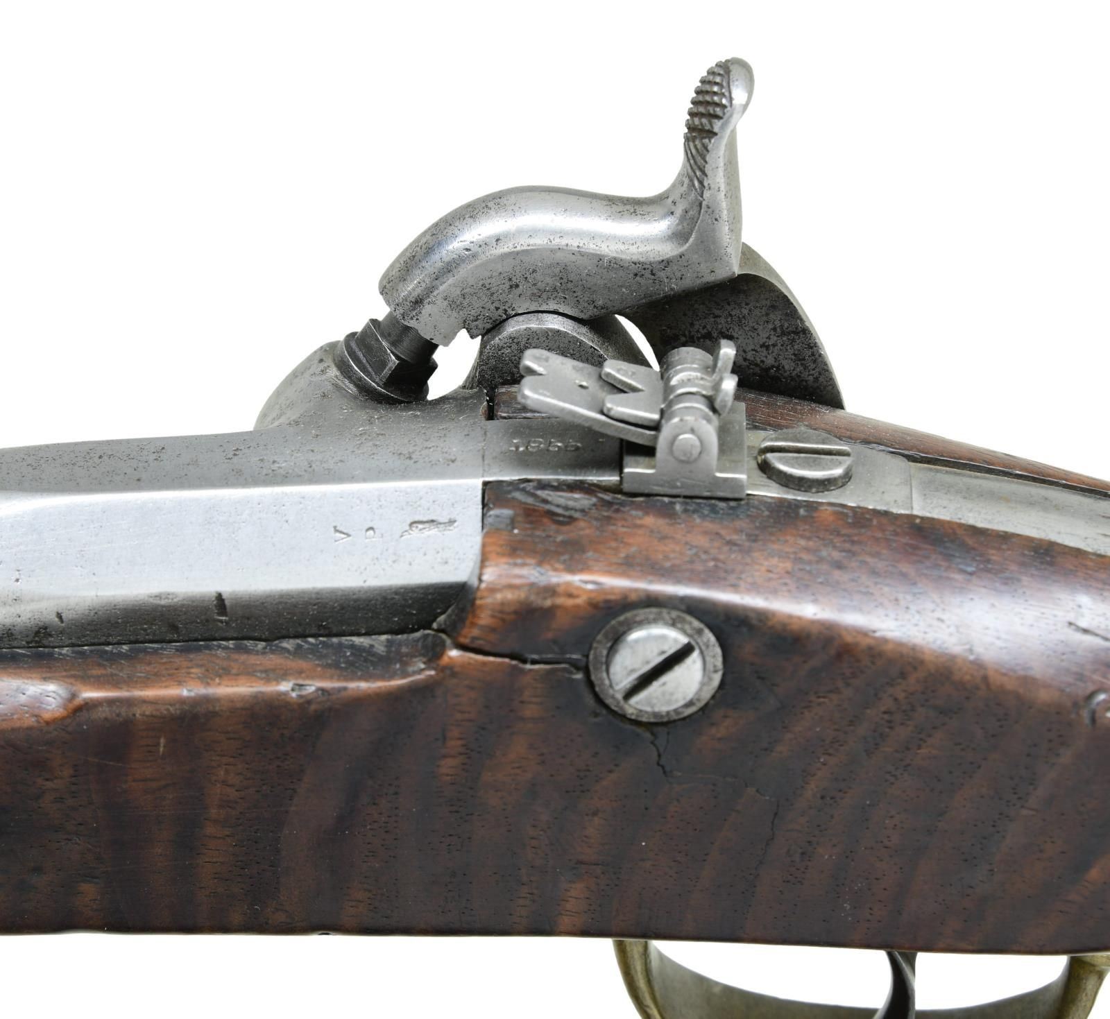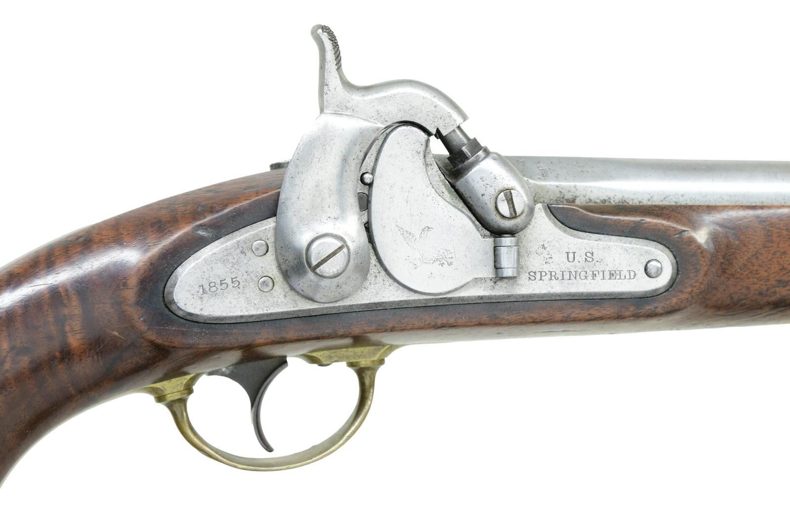 STOCK. Cal. 58. S# Assembly #5. A little over 4,000 of these pistols were made between 1855 and 1857. This example is of the standard configuration with a 12" round barrel fitted with a bridled steel ramrod. The rear of the barrel has "VP" and eagle head proofs. Tang is dated "1855" in front of a two-leaf rear sight. The small lock is fitted with a Maynard self-priming device stamped with an eagle on the cover. "US SPRINGFIELD" is at the front of the lock and the tail is dated "1855". Brass-mounted American walnut stock has a lanyard ring on the buttcap, which is also stamped with assembly #5. The continuation of the back strap is made of steel and has mortices for attachment of a brass-mounted buttstock, which is included. This stock is original type and has assembly #7 on the bottom tang. Buttplate is stamped "US." CONDITION: fair to good. Iron and steel were cleaned to silver gray. The tape primer is complete and operating. Stock shows cleaning and refinishing over a large number of scattered marks. No inspector's markings are visible. Brass is toned to mustard yellow. The stock is in like condition but does not fit very well. The sling loop was broken and repaired with superglue. (01-24345/MGM). ANTIQUE. $3,000-4,000.