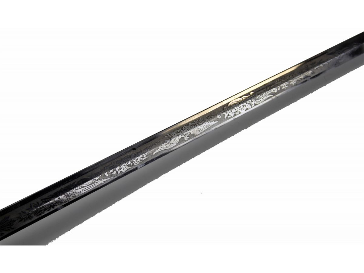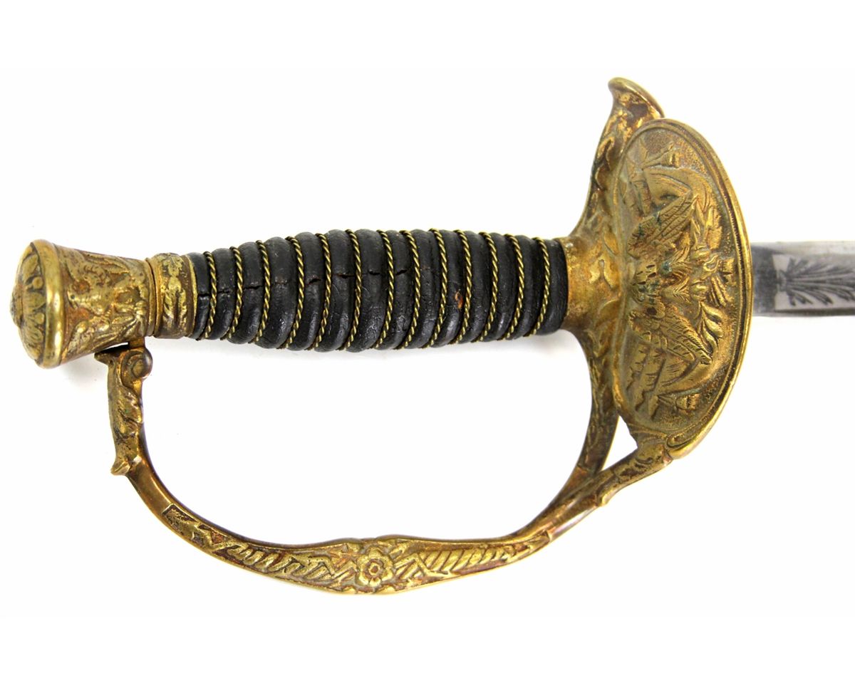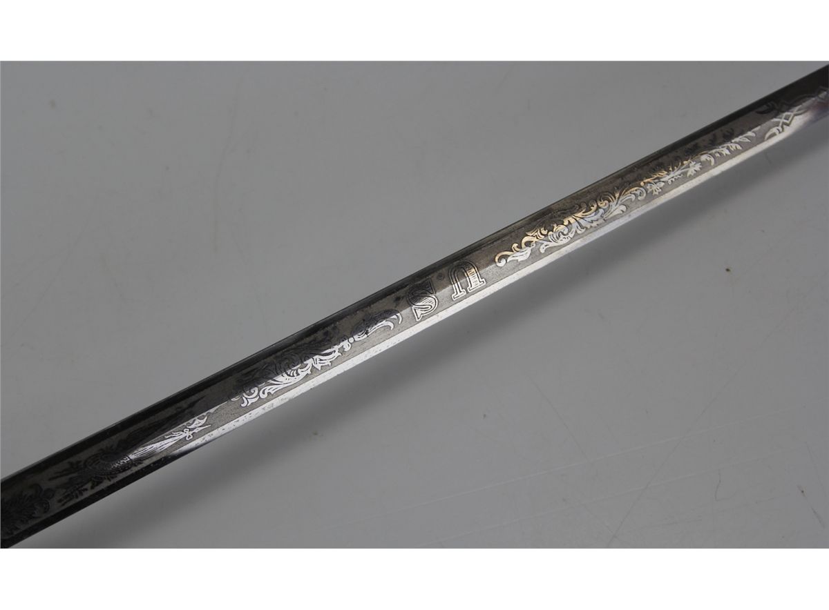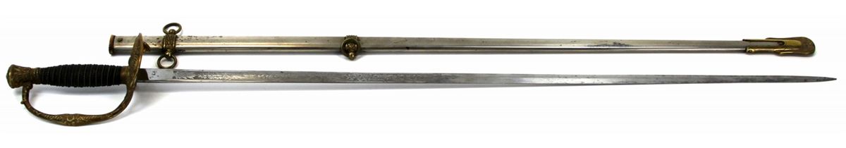 US MODEL 1860 STAFF & FIELD SWORD W REED & SONS US Model 1860 Staff & Field Officer's sword, by William Reed & Sons, Boston, Mass. Gilded brass hilt, with "D" knuckle bow, one sided clamshell guard, and wire wrapped leather grip. 30 inch blade, etched "US" with patriotic motif. Type: Sword Country: US Blade Length: 30 inches Condition: Minor darkening towards tip of blade, otherwise bright. Hilt fittings tight, grip good. Scabbard complete and free of dents. Overall very good.