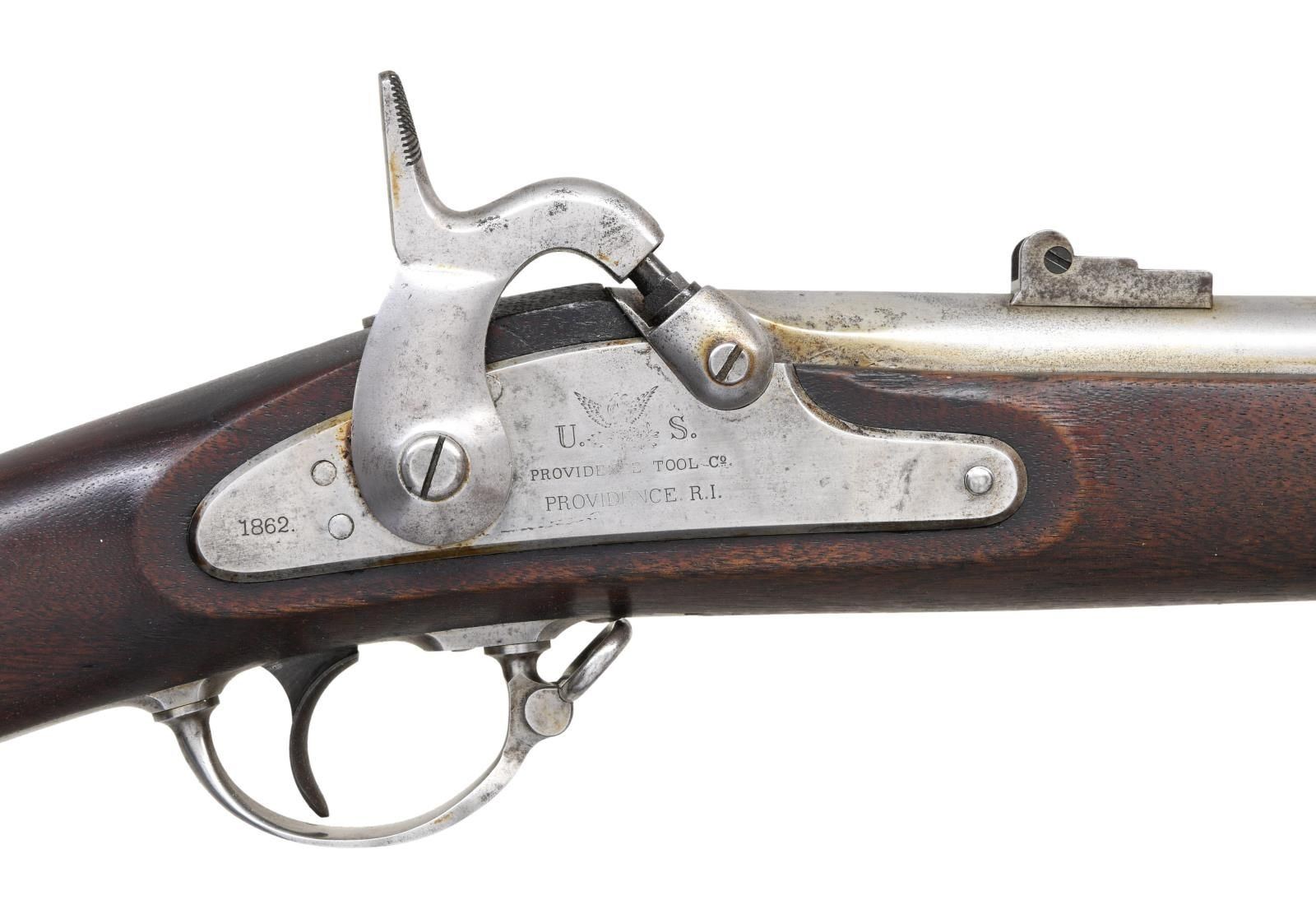 PROVIDENCE TOOL CO. Cal. 58. NSN. This contractor made 70,000 1861 muskets. This example is in standard configuration with 40" barrel dated "1862" which attaches to stock with three spring retained bands. Rear sight has two flip up leaves. Lock dated "1862" is also marked with "US" and eagle along with maker's name and "PROVIDENCE R.I.". Walnut stock has "US" marked buttplate, inspector initials "RJB" are on left side. CONDITION: very good to fine. Iron parts show cleaning to original bright polish and are presently silver over some scattered pitting. Stock is very fine with what appears to be original finish with some added oil. Inspector's markings are fairly sharp. There is a crack at right side of barrel tang running down toward lock, otherwise wood is sound. Bore is shiny with some scattered pits. Mechanically good. (01-24259/MGM). ANTIQUE. $1,800-2,600.
