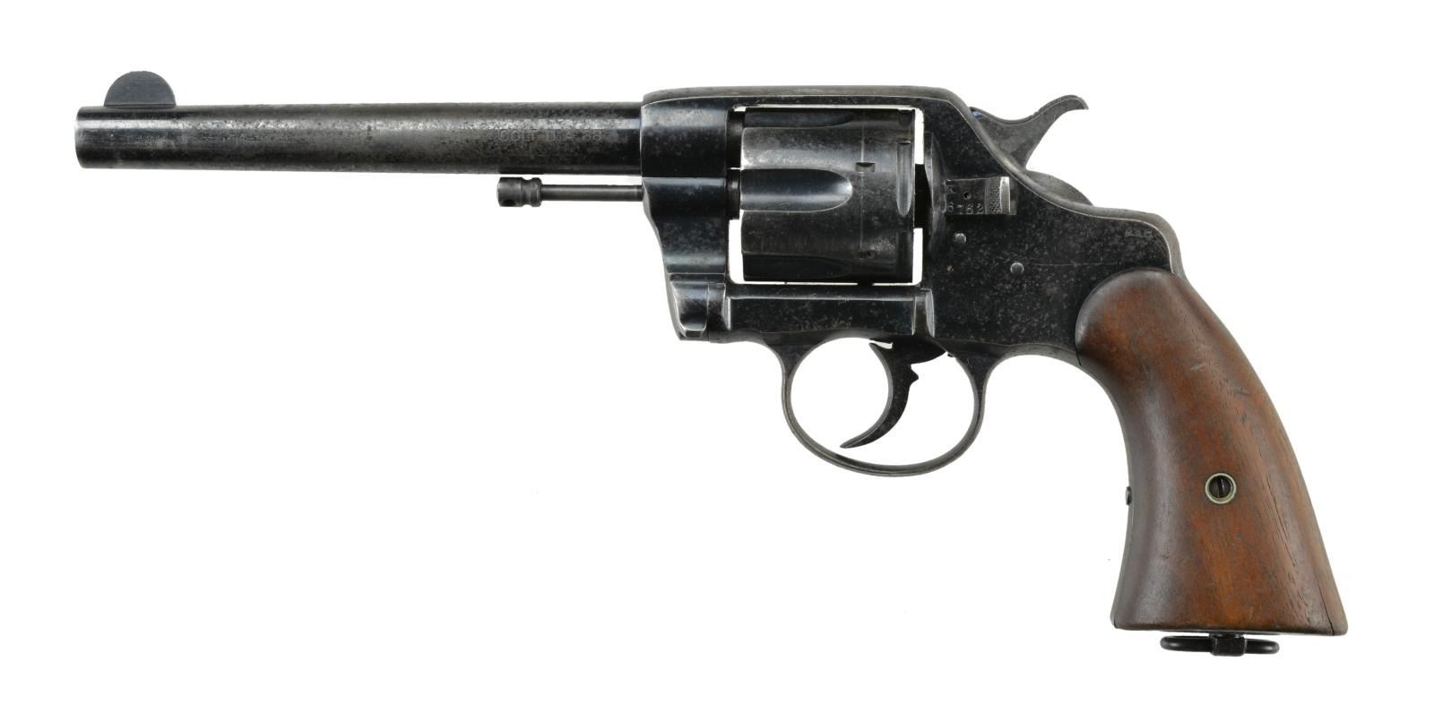 Cal. 38 Colt. S# 196762. Bbl. 6". Round notch front sight. Blued finish. Matching numbers on cyl latch, frame, crane & stencil numbers on both grip panels. RAC inspectors marking present on bottom of both grip panels, bbl, rear of cyl. & frame. Last patent date is March 5th, 1895. Trigger pull is stiff notably in DA. Smooth walnut grips. CONDITION: left grip panel has a 1/2" crack at bottom rear, grips otherwise show dings & handling marks from the years. Metal retains 40% original blue w/ drag line on cyl. oxidation & fading to gray throughout. Good bore w/ scattered oxidation. (22-4356/MJC). CURIO. $300-500.