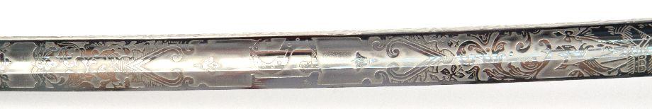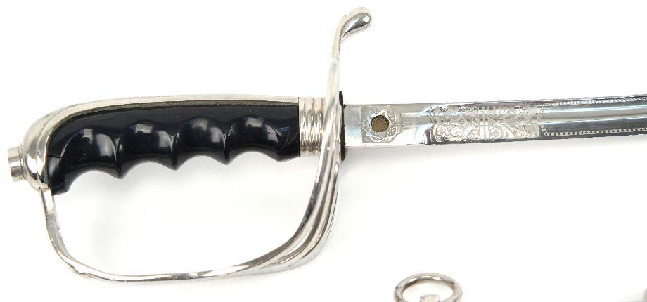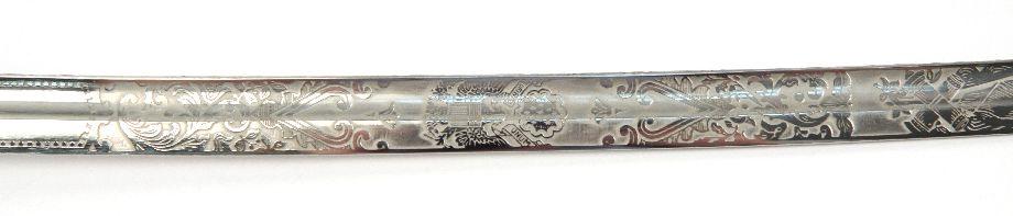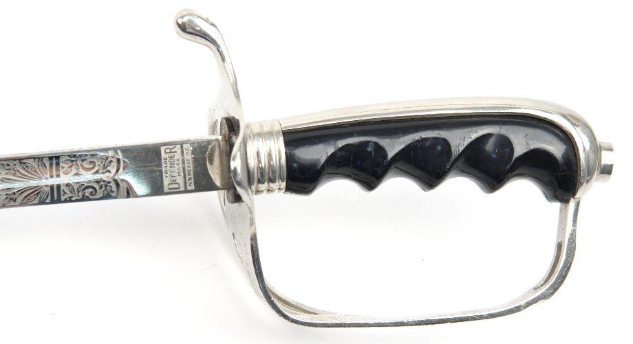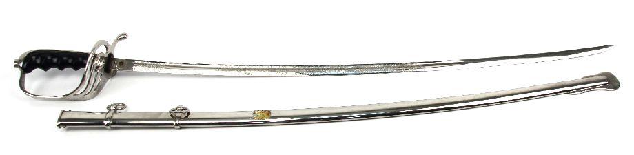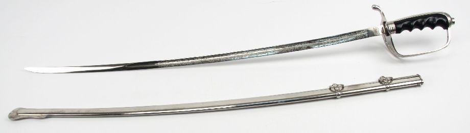 US Model 1902 officers sword. 30 inch curved blade, with decorative scroll etching, with cannons, crossed cannons, US seal, and "US". Nickel plated rolled steel scabbard. Sword is in overall very good condition.