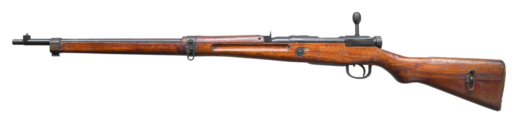 Cal. 30-06. S# 1223277. Bbl. 26" Eddystone dated 8-18. Standard 1917 sights. All visible parts appear to be of Eddystone mfr. with many bearing correct "E" markings. Blued finish. Walnut stock set with bottom mounted sling swivels. CONDITION: stock has an armory oil finish with a light chip behind upper tang, some dings, worn finish & handling marks. Metal retains perhaps 30% blue with overall fading to gray, edge wear, scattered oxidation & handling marks. Action functions properly when hand cycled. Very good bright bore with strong rifling. (25-2822/MJC). CURIO. $400-600.