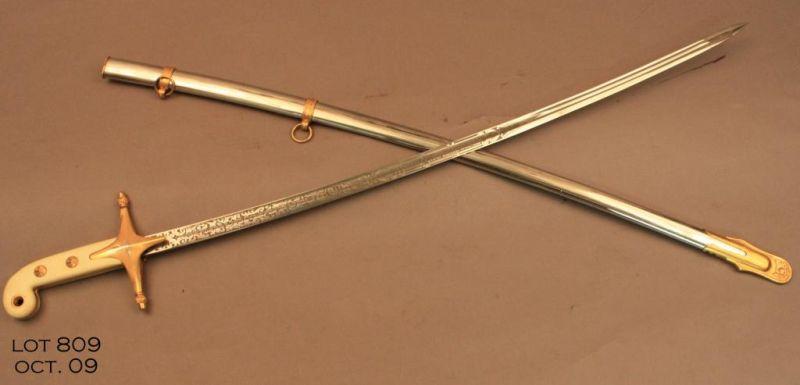 US Marine Corps Officer’s sword and scabbard, approx. 39” overall and in fine condition showing the majority of its original polish and etching to the blade and including an inscription “Gregg R. Kendrick” on the left upper portion of the blade.The scabbard is nickel plated with gold finished drag and handing ring mounts. The faux grips are in excellent condition and the cross guard shows the majority of its gold finish. Would be interesting to research further. Est.:$200-$300.