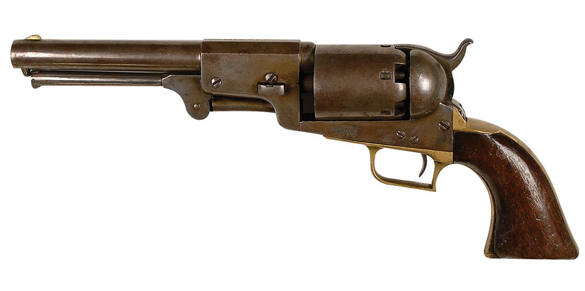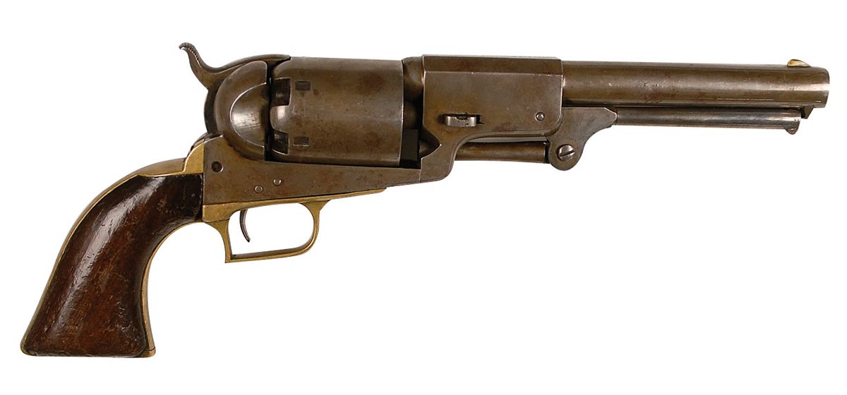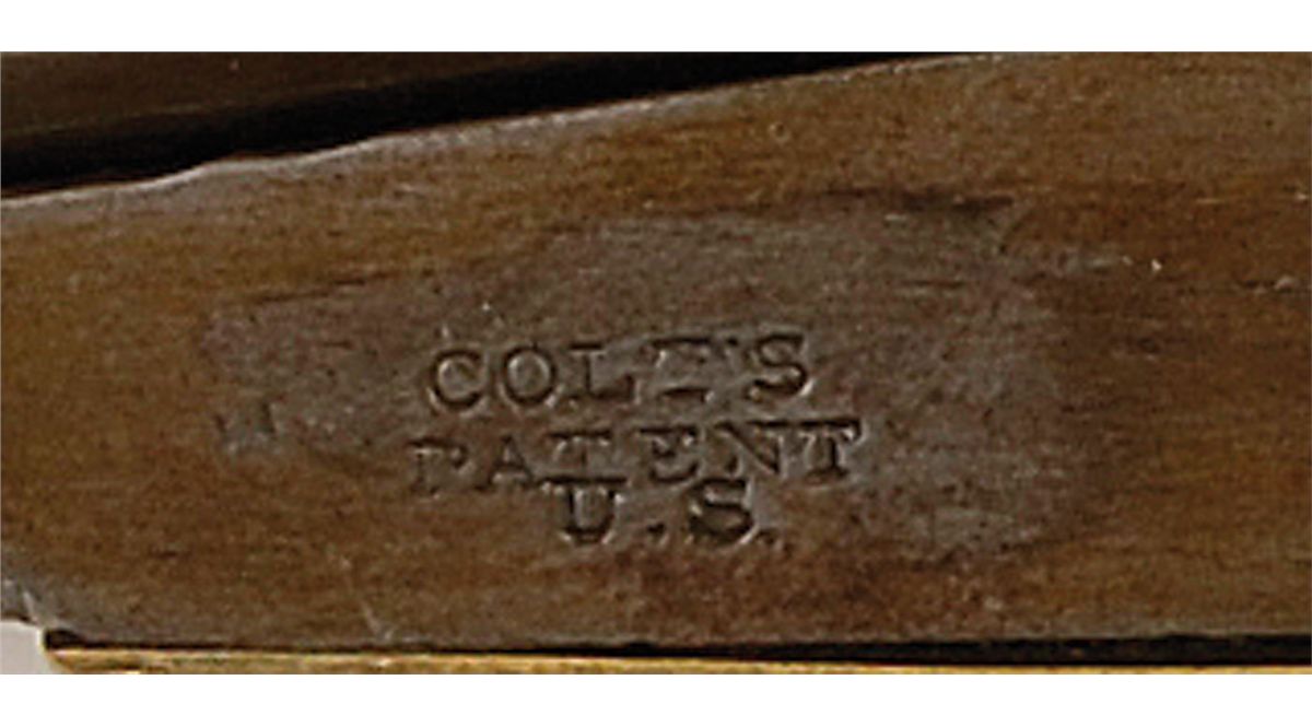 #9732, caliber .44 with a 7.5” part round/part octagonal barrel with a fair bore. The barrel has the marking “- ADDRESS SAM = COLT NEW YORK CITY” and the left side of the frame is marked “COLT’S / PATENT / U.S.“ All numbers match, including on the wedge. The steel surfaces have been cleaned in the past and now have a smooth dark gray patina. There is no cylinder scene remaining. The barrel lug has a small surface crack at the very rear that looks like an original forging defect. The brass gripstraps have an ocher patina and the one-piece walnut grip shows wear with an old refinish. This big Colt was made in 1851 and was one of only 2700 made. Because this total included revolvers for civilian sales, U.S. military issue Second Model Dragoons are very uncommon.