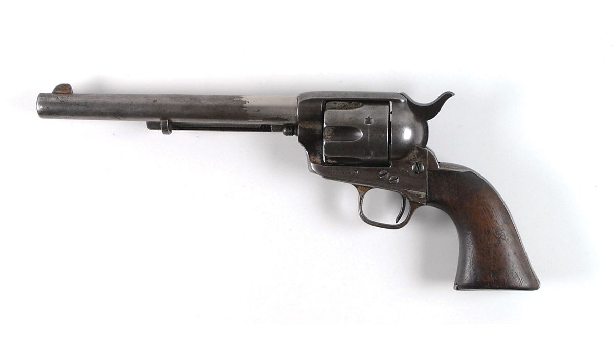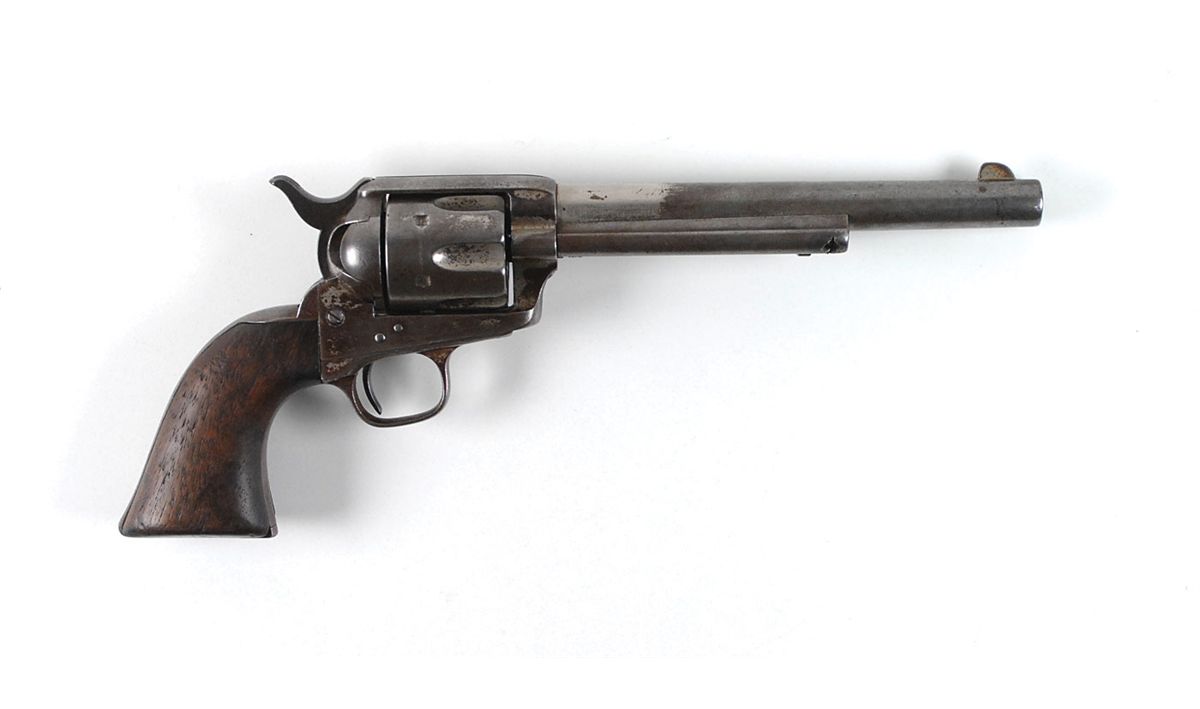 ‘US’ Marked Colt Single Action Army revolver made in 1874. #13721, cal. .45 Colt, 7.5? barrel with the correct early italic-style lettering and a very good bore. The barrel is numbered 8622 under the later style ejector rod housing with a crescent-shaped head on the ejector rod. The frame, triggerguard, and backstrap have matching numbers “13721,” with the cylinder correctly having only the last four digits “3721.” The one-piece walnut grip shows moderate wear and has no trace of a military inspector’s cartouche. The frame has a two line patent marking and “U. S.” on the left side, while the triggerguard and backstrap have no military inspector’s initials. The enclosed copy of a factory letter indicates an October 7, 1874, shipping date to Schuyler, Hartley, and Graham—one of Colt’s largest distributors for the western trade. A special notation in this letter states that this is a “Gov’t Sales” gun, meaning that this gun was an overrun on a government contract and sent to the commercial market. The finish was changed by Schuyler, Hartley, and Graham to nickel plating so that retail customers would not be suspected of having a stolen “US” marked revolver. About 5% of this nickel plating remains. All of the factory lettering is in very good condition. The bottom of the backstrap shows scratches where a name was removed and the screw hole in the ejector rod housing is slightly marred. The revolver is in good working order with no worn hammer notches.