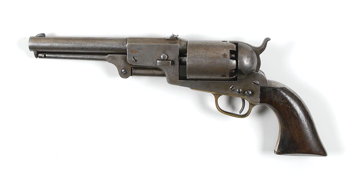 Serial no. 16636, caliber .44. The 7.5? part round/part octagonal barrel has a bore with strong rifling and even light pitting. This variation is one of the only 1200 to 1500 revolvers that have a frame cut for a shoulder stock and have the associated fourth frame screw. The top rear of the barrel is cut through the “NEW YORK” address for the installation of the factory folding leaf sight. All numbers match with the numbers on the cylinder and steel backstrap only partially legible, however, enough partial digits seem to be in the proper locations. The wedge is not numbered. The barrel address is good and the frame marking “COLT’S / PATENT / U.S.” is very clear. The steel surfaces have been cleaned and the metal has a light gray patina with minor fine pitting on the loading lever. The brass triggerguard retains strong traces of silver plating. The one piece walnut grip has been refinished and shows wear at the butt with a small chip at the toe and heel. The mechanism functions well. The end of the arbor has been remachined to tighten the barrel. This big Colt was made for the US Army in 1858. This is an antique revolver and transfers with no federal restrictions.
