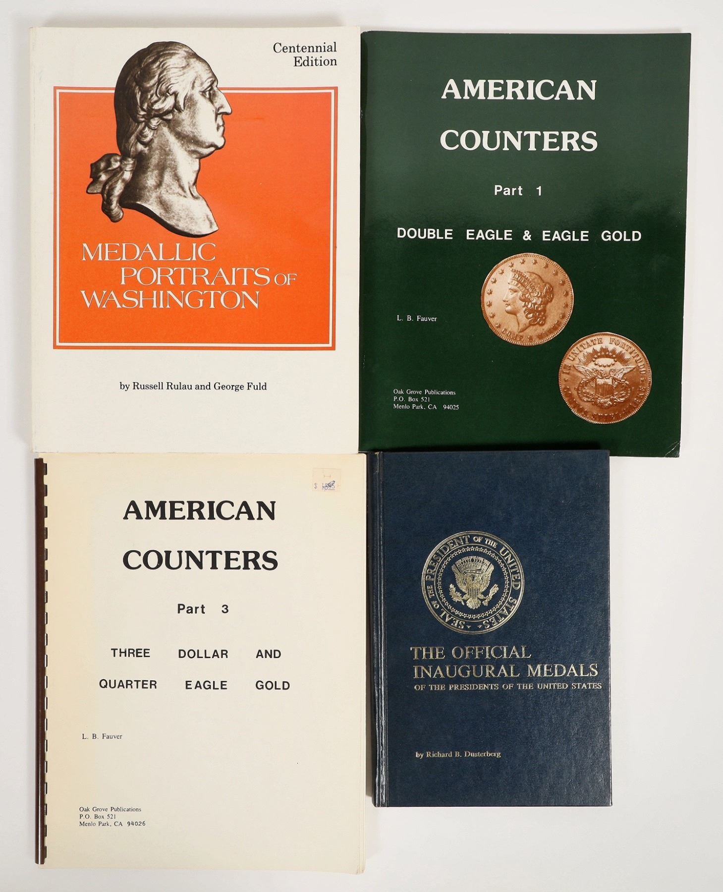 Lot of four books: The Official Inaugural Medals of the Presidents of the United States, Richard B. Dusterberg,1971. Great condition. Medallic Portraits of Washington, centennial edition, Russell Rulau and George Fuld, 1985. Average condition. American Counters, Part 3, Three Dollar and Quater Eagle Gold, L.B Fauver, 1989. Average condition. American Counters, Part 1, Double Eagle and Eagle Gold, L.B Fauver, 1983. Average condition.