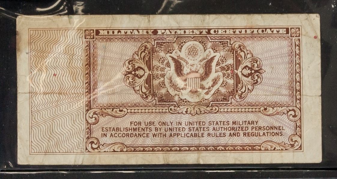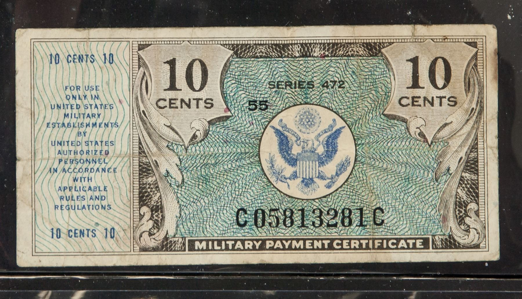 One 10 cent United State military payment certificate series 472, first issued and one 1 cent Hong Kong bank note, initially released in May 1941, 4.1-5.4 x 8.9-11 cm