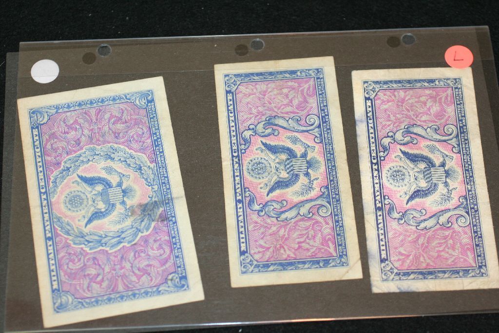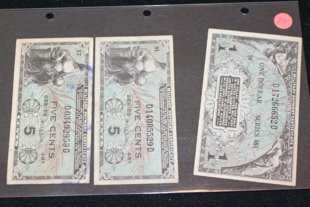 US Military Payment Certificate, 5 Cent (2) & $1, Lot of 3