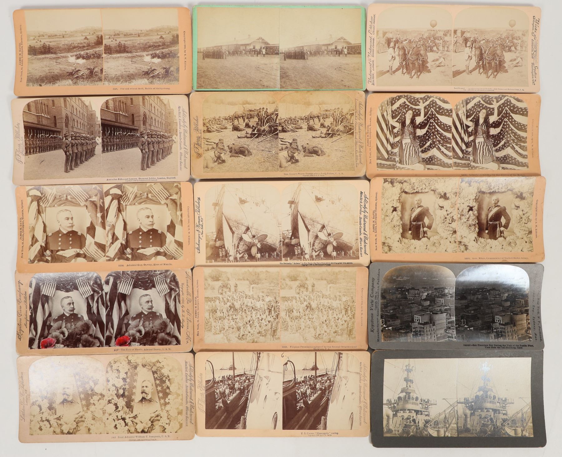 Lot of 15. All appear to be different. Military/political views including: illustration of Gettysburg; Australian troops at Diamond Jubilee; multiple of Admiral Dewey; Filipino prisoners in the Spanish-American War; Battleship "Indiana" dry dock; troops at Little Falls, Minnesota, 1883; Lord Roberts' Army advancing toward Pretoria; Liberty mourning the Heroes of the Maine; Pacific Fleet in SF Bay, and more.