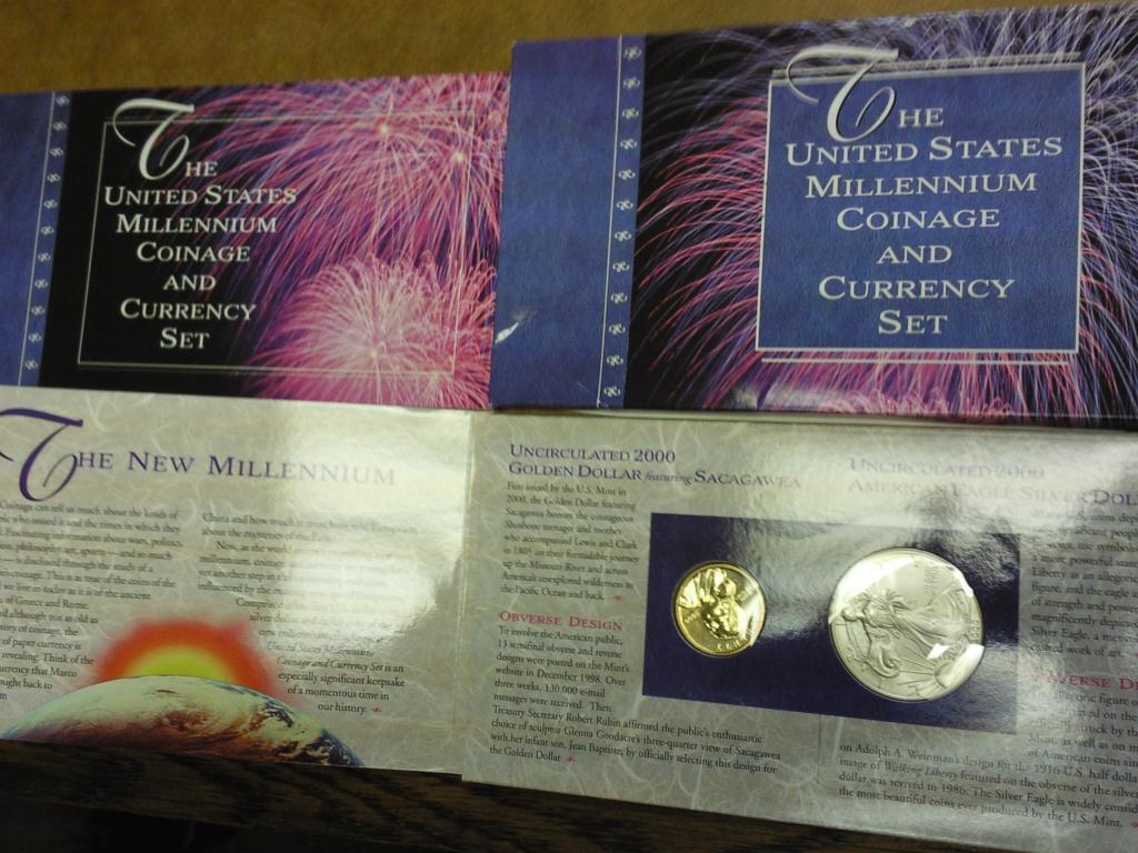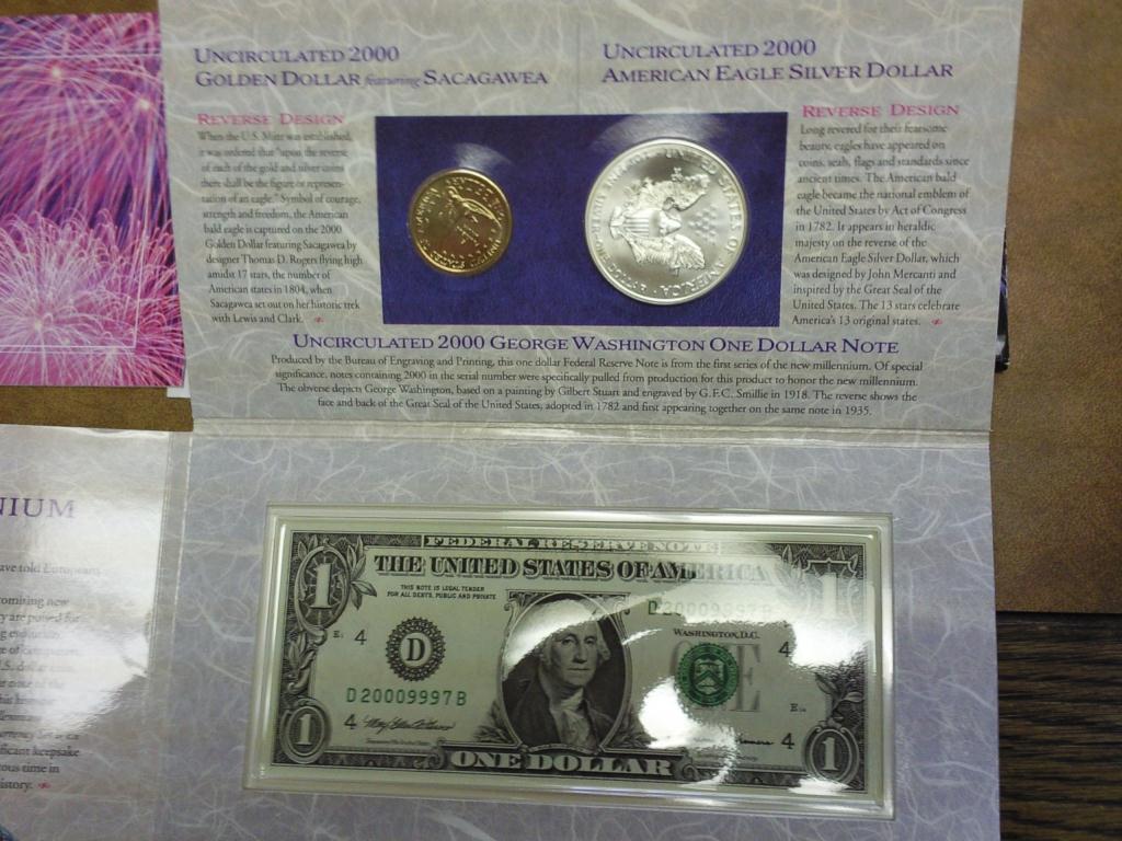 Includes: 2000 American Silver Eagle (UNC), 2000 Sacagawea Dollar (UNC), And 1999 One $ FRN Serial # Starts With 2000