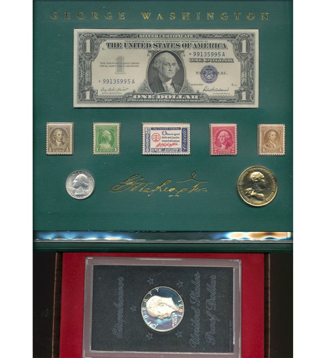 US Mint; 1796-1996 Bicentennial of George Washington Coin, Banknote and Stamp Set & 1971 Eisenhauer Proof Dollar in Case.