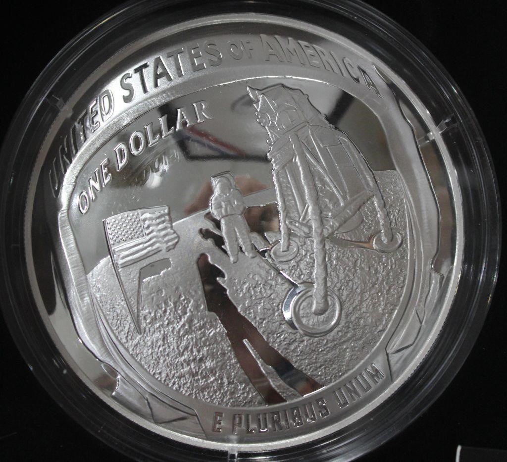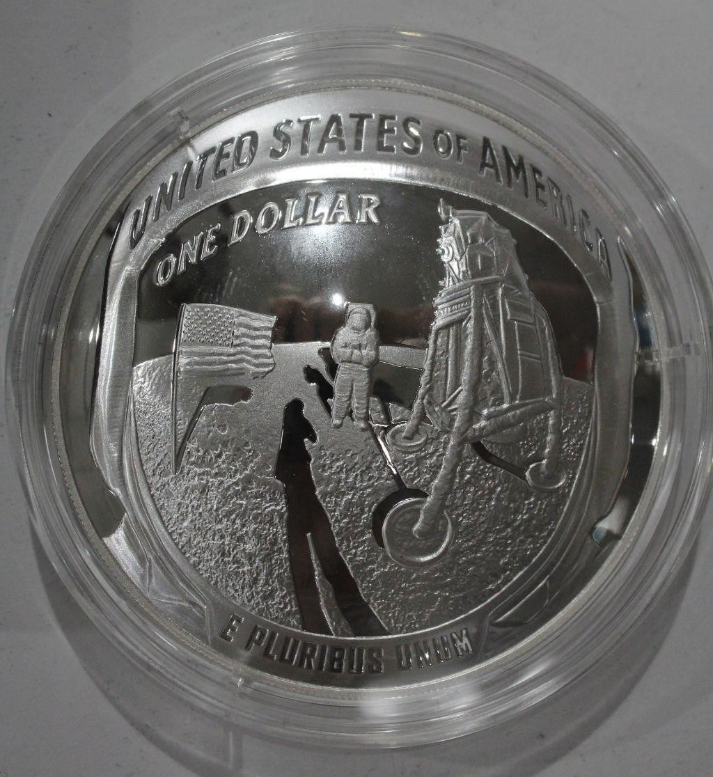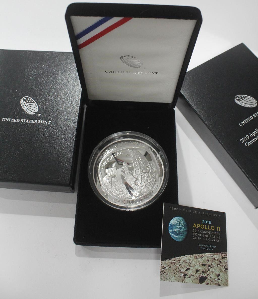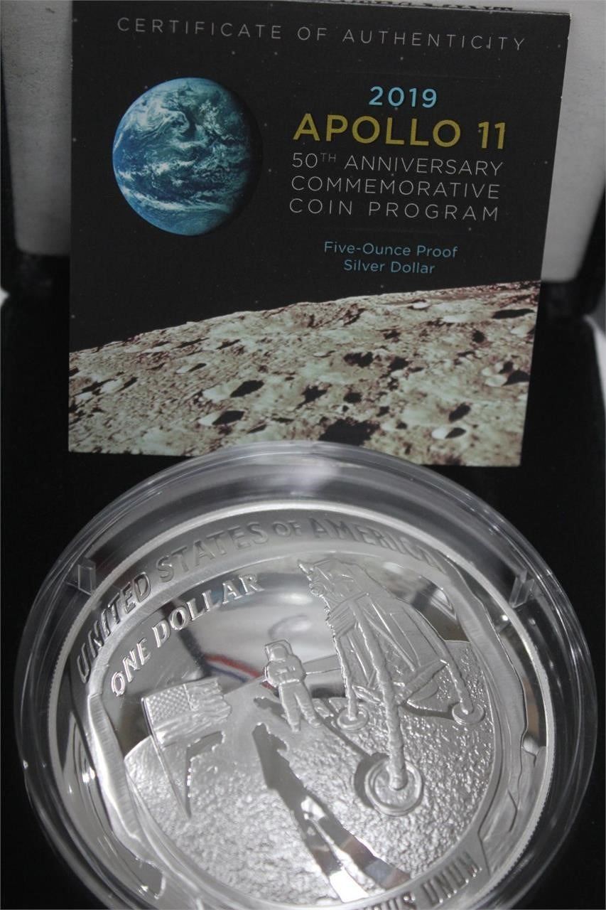 A US Mint 2019 Proof Apollo 11 50th Anniversary Commemorative Coin 5 oz .999 Silver. In original Box & COA. The First Domed Ounce US Coin!