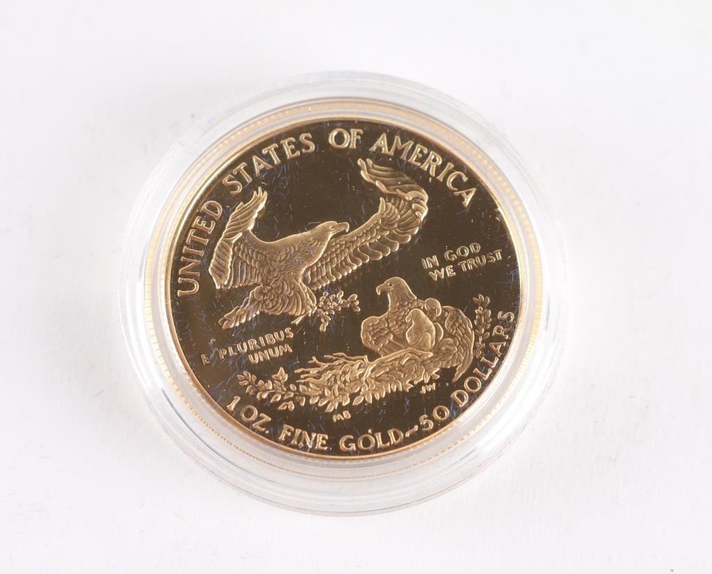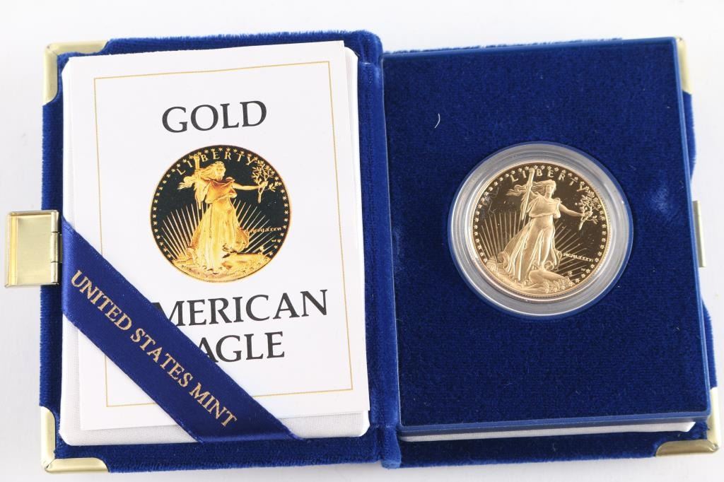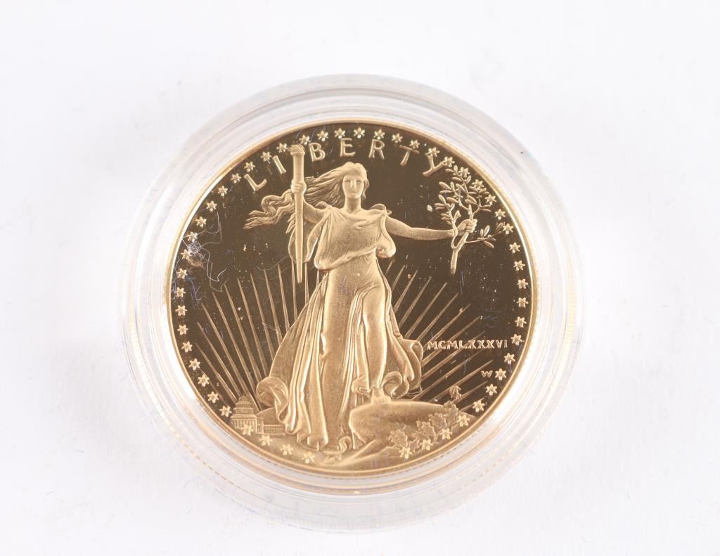 1986 one ounce proof gold bullion coin in OGP w/COA. Minted to exacting standards, the obverse (front) design is inspired by whats often considered one of Americas most beautiful coins: Augustus Saint-Gaudens celebrated $20 gold piece, minted from 1907-1933. Legacy details have been restored for the obverse design include modifications to the Capitol Building, stars, torch, sun rays and other design elements based on the original bronze cast. Obverse Inscriptions: LIBERTY; YEAR (in Roman Numeral); Artist’s Initials Reverse Inscriptions: UNITED STATES OF AMERICA; E PLURIBUS UNUM; IN GOD WE TRUST; 50 Dollars and 1 Oz. Fine Gold. Government Guarantee: What truly sets American Eagles apart is that their weight, content, and purity are guaranteed by the United States Government. Investors can buy them with confidence, knowing the coins contain their stated amount of gold. In addition, long-term savers can include American Eagles in their Individual Retirement Accounts (IRAs).