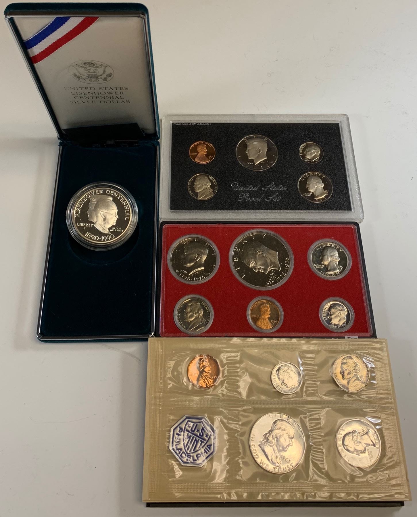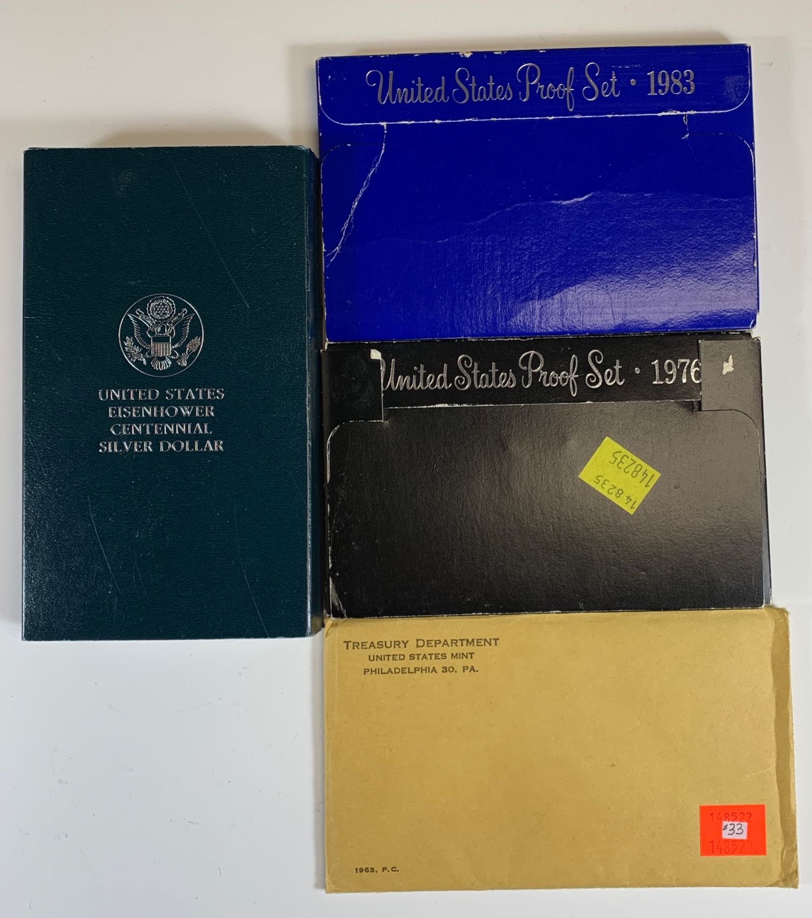 US Mint Sets: 1963 (silver 10c, 25c, 50c), 1976, 1983 plus 1990 proof silver dollar (Eisenhower Centennial).