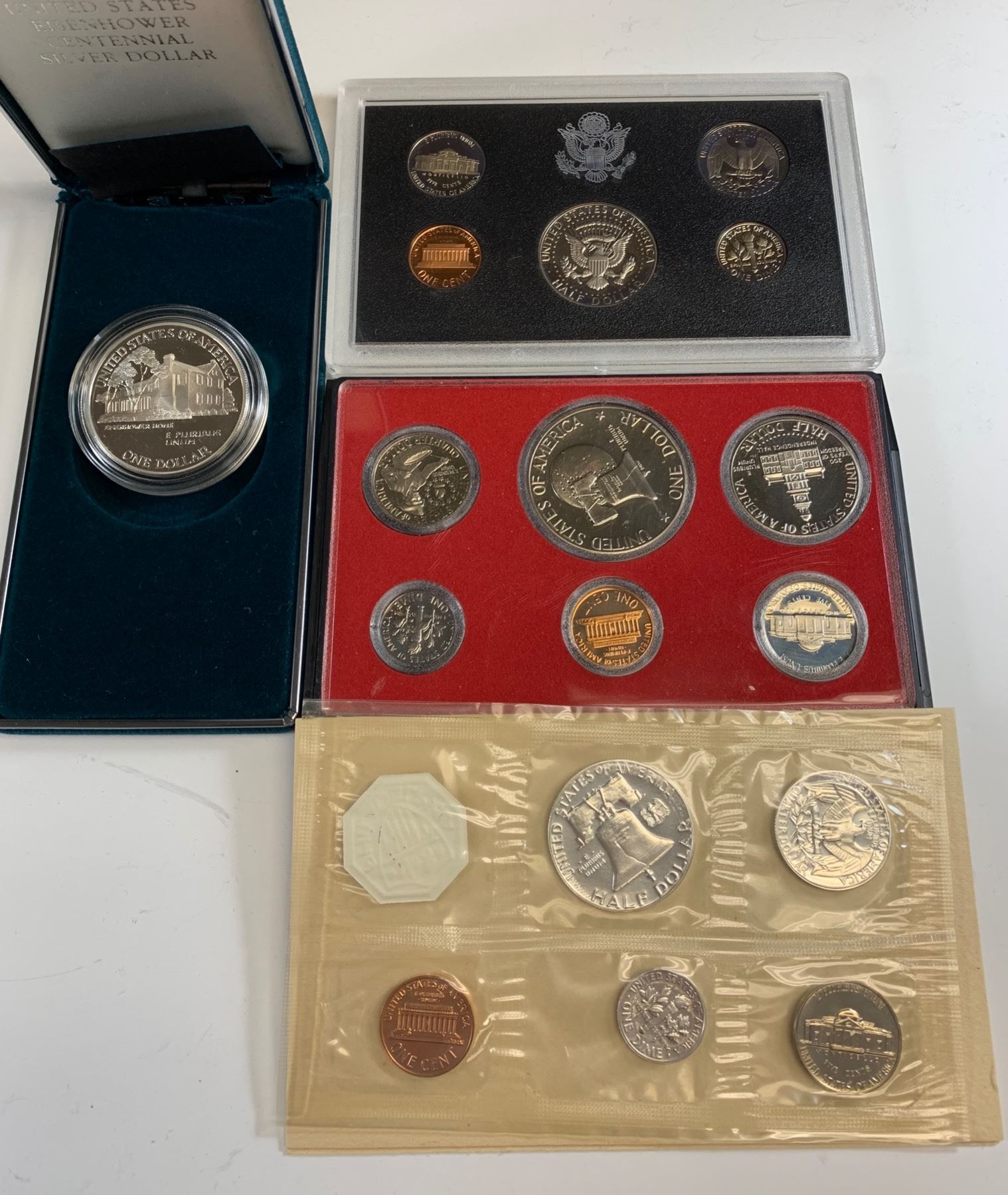 US Mint Sets: 1963 (silver 10c, 25c, 50c), 1976, 1983 plus 1990 proof silver dollar (Eisenhower Cent