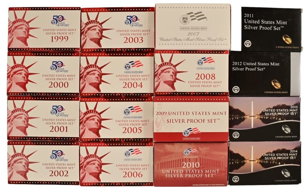 In original boxes, collections of (16) sixteen US Mint Silver Proof Sets