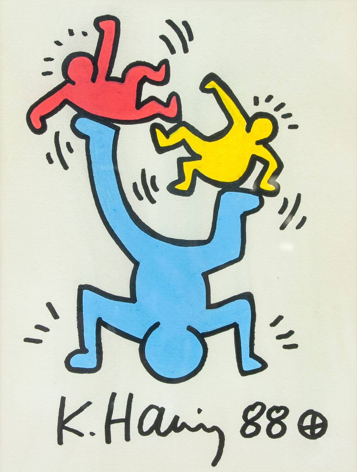 Mixed media on paper. American Pop Art School, signed K. Haring, possible signature of Keith Haring and inscribed '88. 24 x 18 cm (9.4 x 7.1 inches), frame: 37.5 x 32.5 cm (14.8 x 12.8 inches). PROVENANCE: Southern Ontario estate.