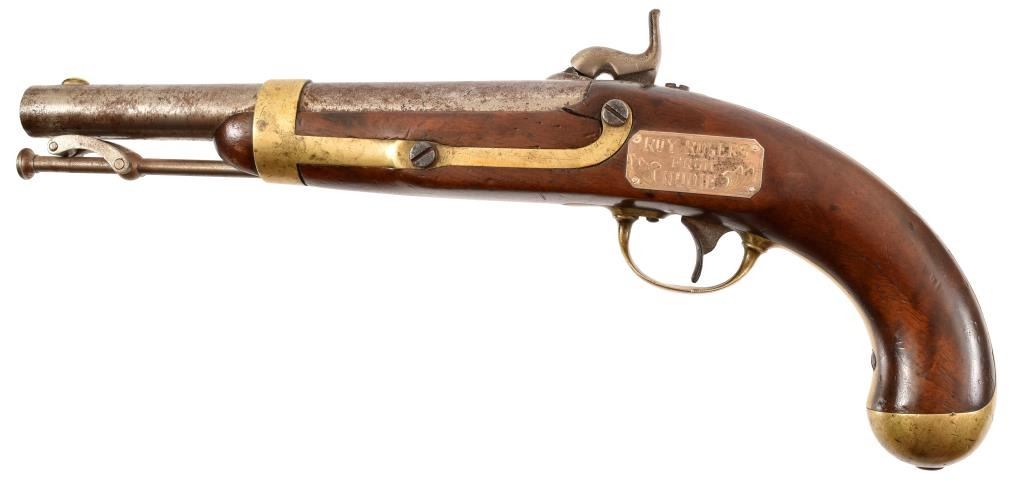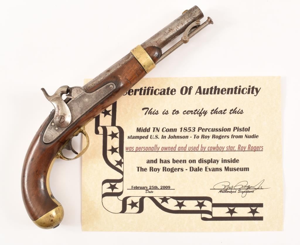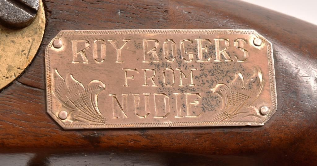 I.N. Johnson US Model 1842. With gold presentation plate engraved "To Roy Rogers from Nudie" Nudie Cohn was the worlds most famous western designer. Roy Rogers & Dale Evans extensively wore Nudie designed outfits. Comes with COA from the Roy Rogers-Dale Evans Museum.
