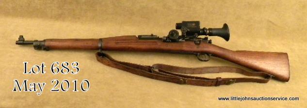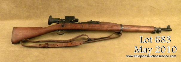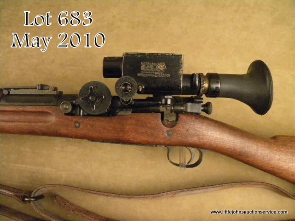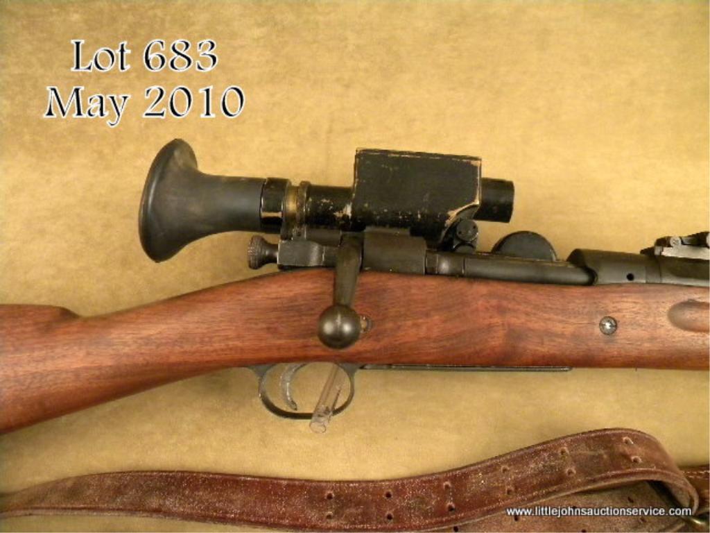 US Model 1903 .30 caliber rifle by Springfield Armory fitted with Warner Swasey sniper scope, #914376, barrel Springfield Armory marked dated 5-18. The metal surfaces are in very good + to near fine condition showing approx. 90%-95%parkerized finish, some scratches and storage marks and some dings on fore end cap. The stock is very good + to near fine with āPā proof behind trigger guard and small numeral ā56ā also in this area with no cartouche on left side over triggerindicating probable arsenal re-build. The bolt is scratched with the numerals 1210-57 for identification purposes, the action is good, the bore is excellent; the sight mount and rubber eye piece are very good + to near fine showing most of the japan black finish over brass with just some scratches and losses at the edges; the optics are clear, the rifle has been returned to arsenal as most snipers of the early era were, but is in immaculate condition with exceptional optics which are normally not this clear. A rare early US sniper rifle; leather sling attached. With original leather scope case in good condition with normal wear. Est.: $3,000-$6,000.